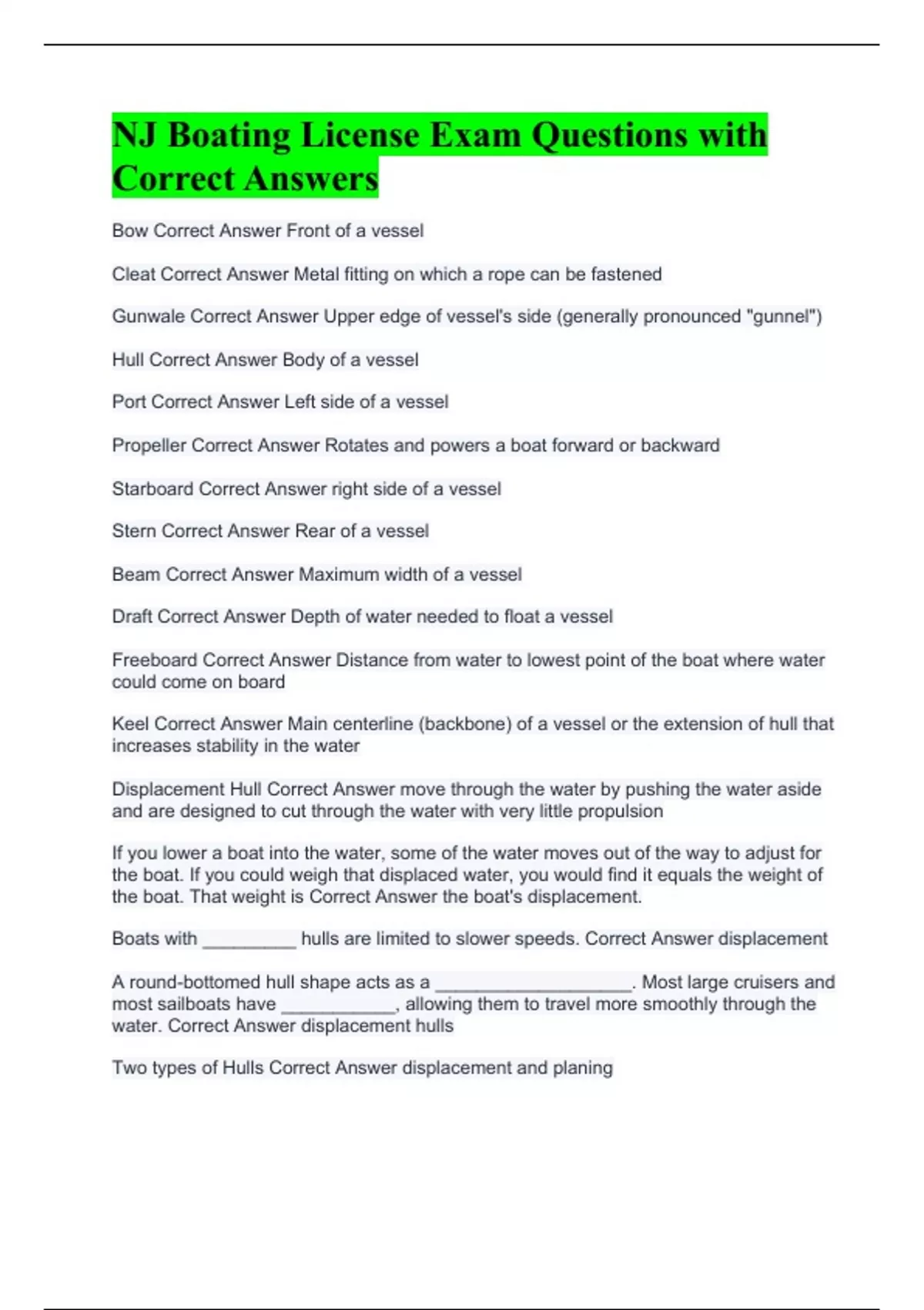 Bow Correct Answer Front of a vessel Cleat Correct Answer Metal fitting on which a rope can be fastened Gunwale Correct Answer Upper edge of vessel's side (generally pronounced "gunnel") Hull Correct Answer Body of a vessel Port Correct Answer Left side of a vessel Propeller Correct Answer Rotates and powers a boat forward or backward Starboard Correct Answer right side of a vessel Stern Correct Answer Rear of a vessel Beam Correct Answer Maximum width of a vessel Draft Correct Answer Depth of water needed to float a vessel Freeboard Correct Answer Distance from water to lowest point of the boat where water could come on board Keel Correct Answer Main centerline (backbone) of a vessel or the extension of hull that increases stability in the water Displacement Hull Correct Answer move through the water by pushing the water aside and are designed to cut through the water with very little propulsion If you lower a boat into the water, some of the water moves out of the way to adjust for the boat. If you could weigh that displaced water, you would find it equals the weight of the boat. That weight is Correct Answer the boat's displacement. Boats with _________ hulls are limited to slower speeds. Correct Answer displacement A round-bottomed hull shape acts as a ___________________. Most large cruisers and most sailboats have ___________, allowing them to travel more smoothly through the water. Correct Answer displacement hulls Two types of Hulls Correct Answer displacement and planing