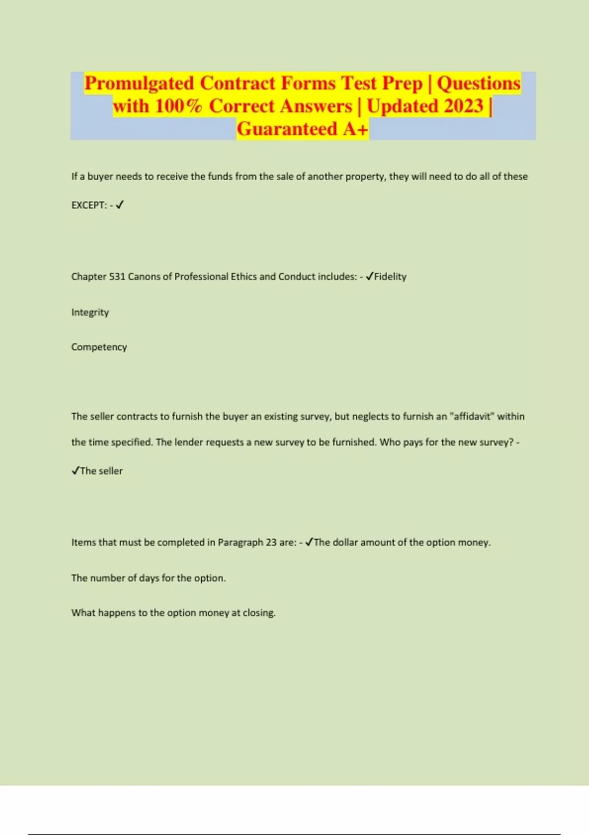Promulgated Contract Forms Test Prep | Questions with 100% Correct Answers | Updated 2023 | Guaranteed A+