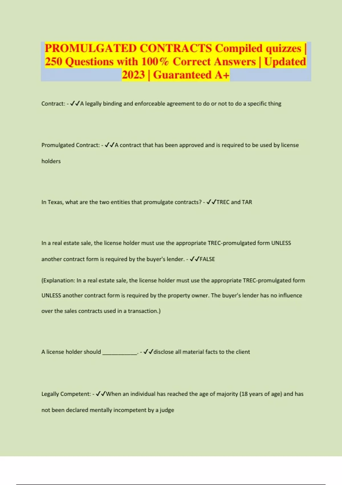 PROMULGATED CONTRACTS Compiled quizzes | 250 Questions with 100% Correct Answers | Updated 2023 | Guaranteed A+