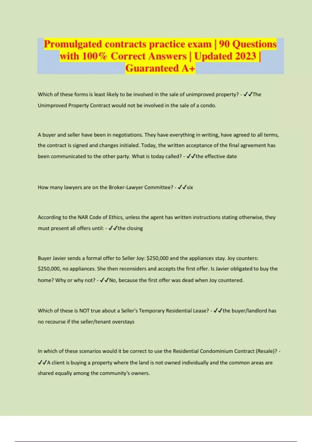 Promulgated contracts practice exam | 90 Questions with 100% Correct Answers | Updated 2023 | Guaranteed A+