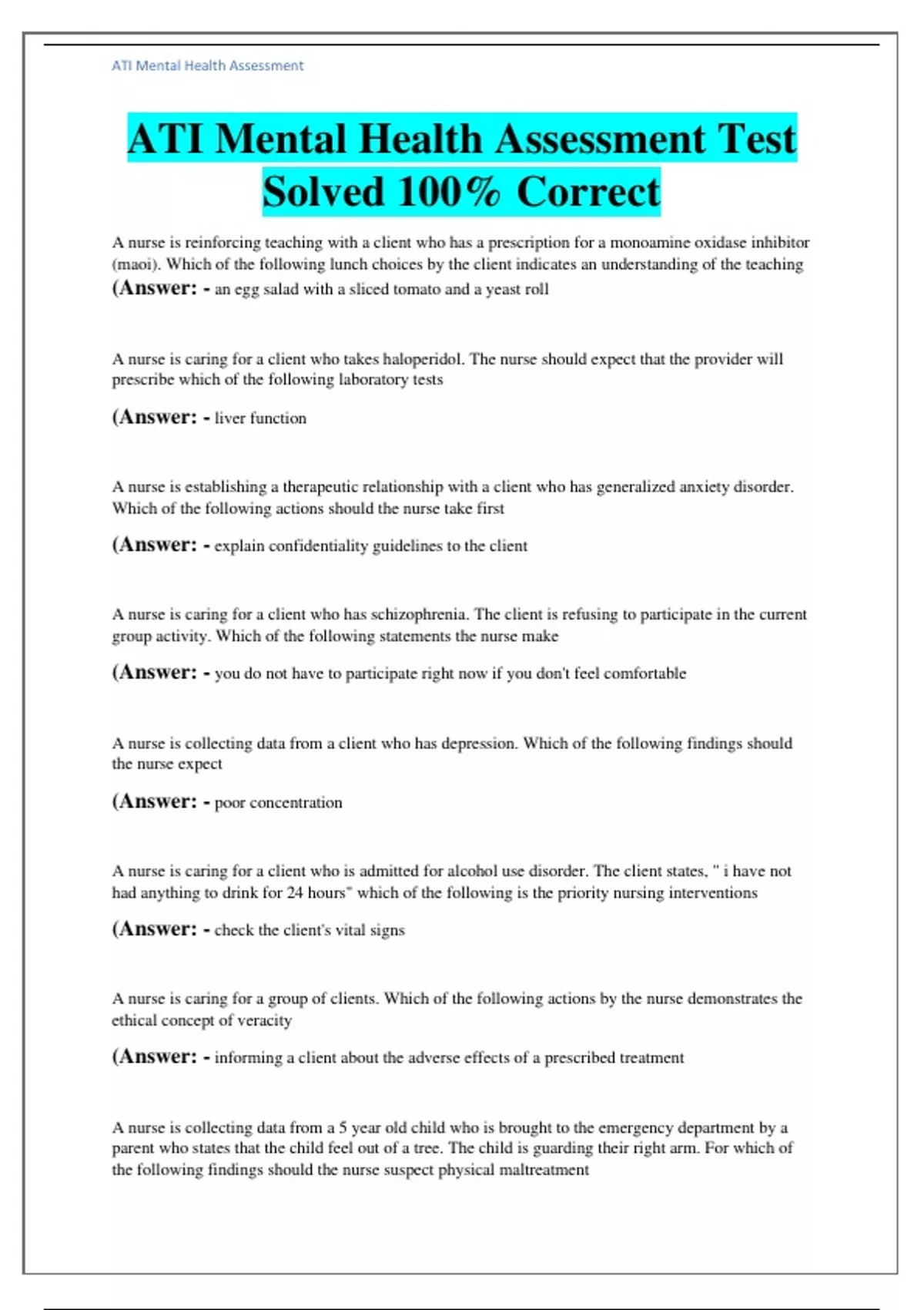 ATI Mental Health Assessment Test Solved 100% Correct A nurse is reinforcing teaching with a client who has a prescription for a monoamine oxidase inhibitor (maoi). Which of the following lunch choices by the client indicates an understanding of the teaching (Answer: - an egg salad with a sliced tomato and a yeast roll A nurse is caring for a client who takes haloperidol. The nurse should expect that the provider will prescribe which of the following laboratory tests (Answer: - liver function A nurse is establishing a therapeutic relationship with a client who has generalized anxiety disorder. Which of the following actions should the nurse take first (Answer: - explain confidentiality guidelines to the client
