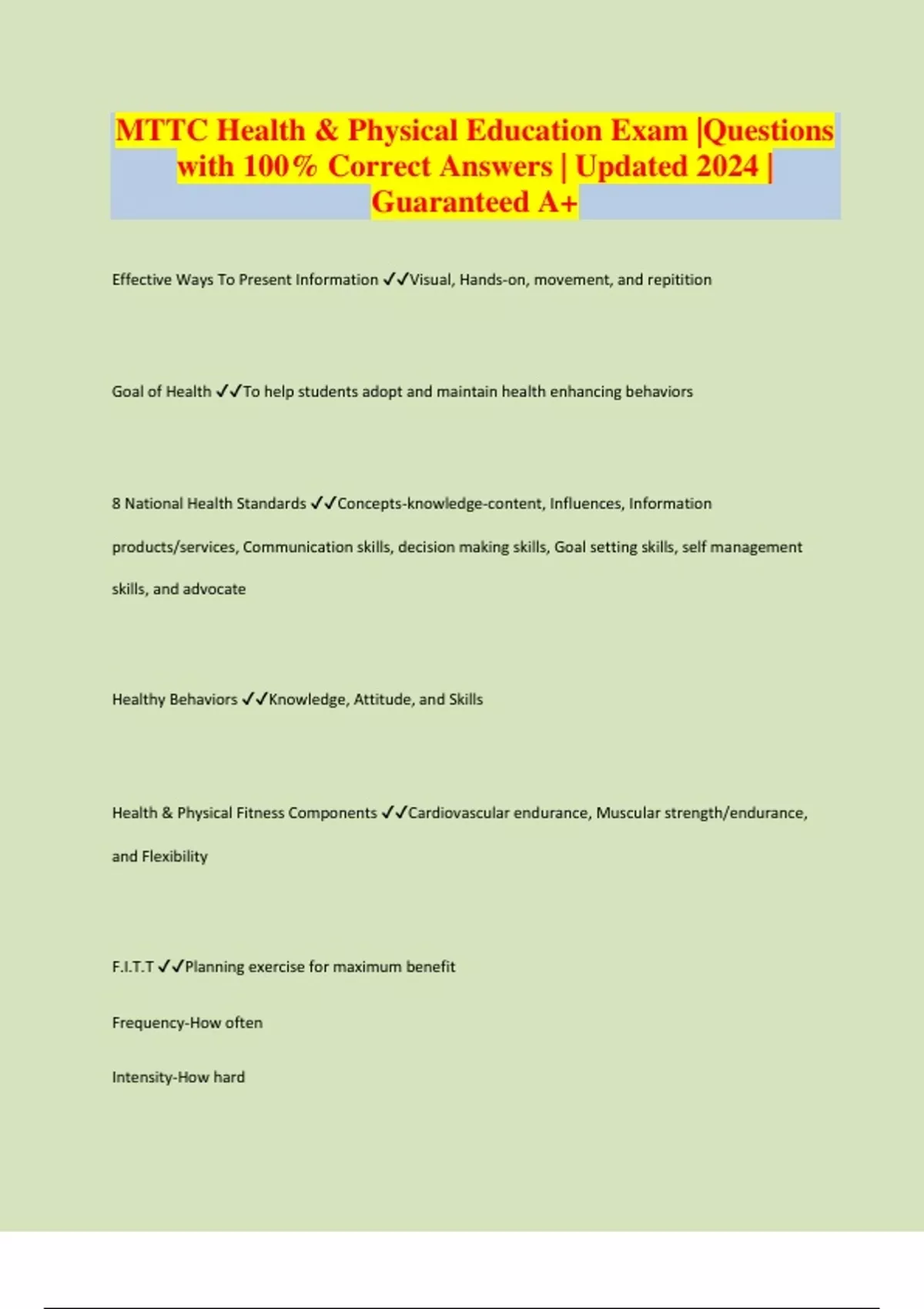 MTTC Health & Physical Education Exam |Questions with 100% Correct Answers | Updated 2024 | Guaranteed A+