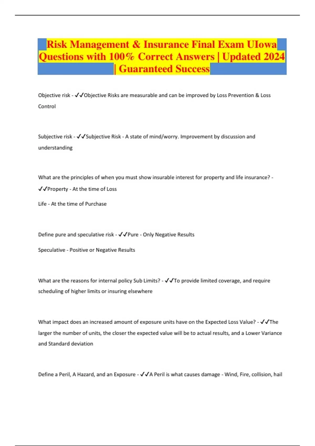 Risk Management & Insurance Final Exam UIowa Questions with 100% Correct Answers | Updated 2024 | Guaranteed Success