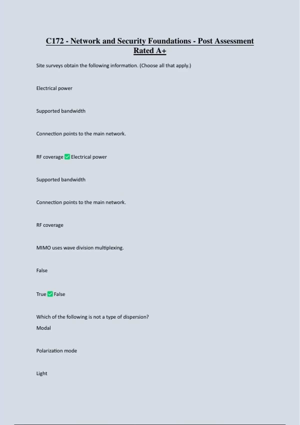 C172 - Network and Security Foundations - Post Assessment Rated A+ Site surveys obtain the following information. (Choose all that apply.) Electrical power Supported bandwidth Connection points to the main network. RF coverage Electrical power Supported bandwidth Connection points to the main network. RF coverage MIMO uses wave division multiplexing. False True False Which of the following is not a type of dispersion? Modal Polarization mode Light Chromatic Light Single-mode fibers use high-power, highly directional modulated light sources. False True True The port number for DNS is ____. 21 23 25 80 53 53 NAT translates private MAC addresses to public ones. False True False Data rates can be much higher in a wired network versus a wireless network
