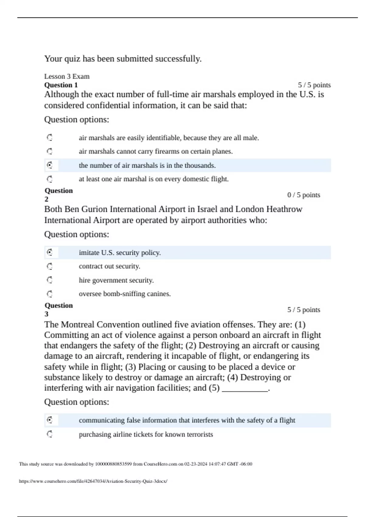 Lesson 3 Exam Question 1 5 / 5 points Although the exact number of full-time air marshals employed in the U.S. is considered confidential information, it can be said that: Question options: air marshals are easily identifiable, because they are all male. air marshals cannot carry firearms on certain planes. the number of air marshals is in the thousands. at least one air marshal is on every domestic flight. Question 2 0 / 5 points Both Ben Gurion International Airport in Israel and London Heathrow International Airport are operated by airport authorities who: Question options: imitate U.S. security policy. contract out security. hire government security. oversee bomb-sniffing canines. Question 3 5 / 5 points The Montreal Convention outlined five aviation offenses. They are: (1) Committing an act of violence against a person onboard an aircraft in flight that endangers the safety of the flight; (2) Destroying an aircraft or causing damage to an aircraft, rendering it incapable of flight, or endangering its safety while in flight; (3) Placing or causing to be placed a device or substance likely to destroy or damage an aircraft; (4) Destroying or interfering with air navigation facilities; and (5) __________. Question options: communicating fa