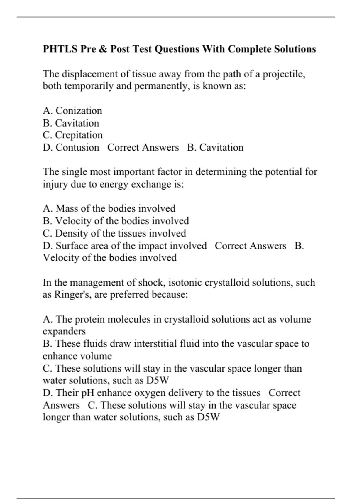 PHTLS Pre & Post Test Questions With Complete Solutions