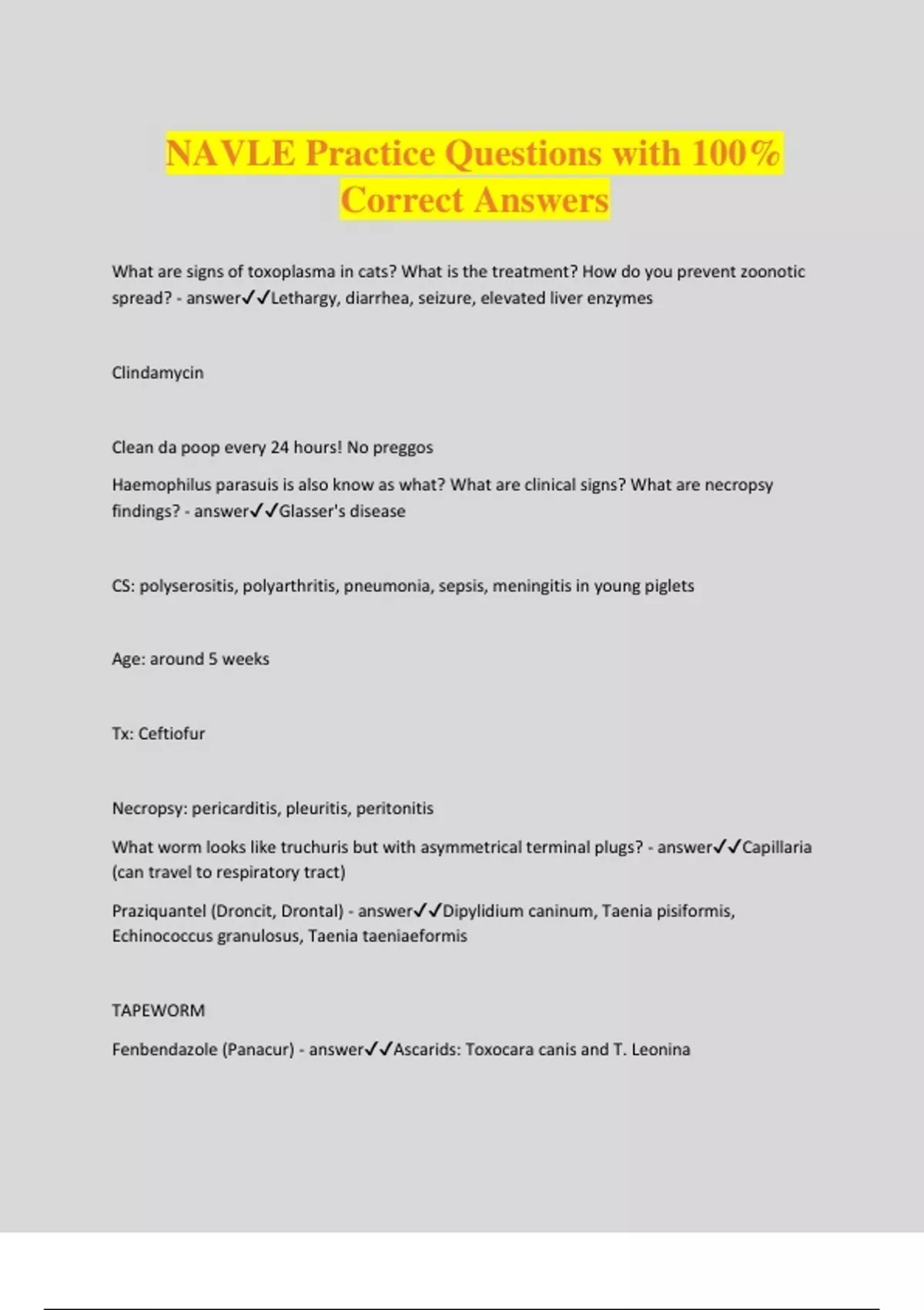 NAVLE Practice Questions with 100% Correct Answers What are signs of toxoplasma in cats? What is the treatment? How do you prevent zoonotic spread? - answerLethargy, diarrhea, seizure, elevated liver enzymes Clindamycin Clean da poop every 24 hours! No preggos Haemophilus parasuis is also know as what? What are clinical signs? What are necropsy findings? - answerGlasser's disease CS: polyserositis, polyarthritis, pneumonia, sepsis, meningitis in young piglets Age: around 5 weeks Tx: Ceftiofur Necropsy: pericarditis, pleuritis, peritonitis What worm looks like truchuris but with asymmetrical terminal plugs? - answerCapillaria (can travel to respiratory tract) Praziquantel (Droncit, Drontal) - answerDipylidium caninum, Taenia pisiformis, Echinococcus granulosus, Taenia taeniaeformis TAPEWORM Fenbendazole (Panacur) - answerAscarids: Toxocara canis and T. Leonina Hookworms: Ancylostoma caninum, Uncinaria stenocephala Whipworms: Trichuris vulpis **not FDA approved in cats but used off label Pyrantel (Strongid) - answerAscarids: Toxocara canis and T. Leonina Hookworms: Ancylostoma caninum, Uncinaria stenocephala and stomach worms Milbemycin Oxime - answerAdu