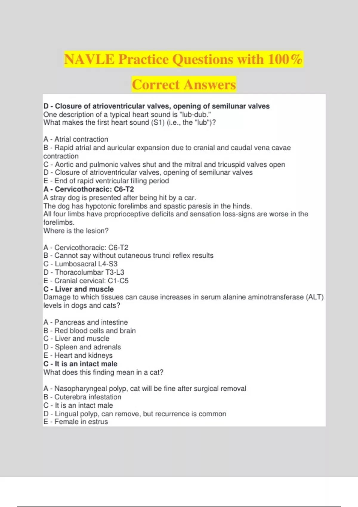 NAVLE Practice Questions with 100% Correct Answers D - Closure of atrioventricular valves, opening of semilunar valves One description of a typical heart sound is "lub-dub." What makes the first heart sound (S1) (i.e., the "lub")? A - Atrial contraction B - Rapid atrial and auricular expansion due to cranial and caudal vena cavae contraction C - Aortic and pulmonic valves shut and the mitral and tricuspid valves open D - Closure of atrioventricular valves, opening of semilunar valves E - End of rapid ventricular filling period A - Cervicothoracic: C6-T2 A stray dog is presented after being hit by a car. The dog has hypotonic forelimbs and spastic paresis in the hinds. All four limbs have proprioceptive deficits and sensation loss-signs are worse in the forelimbs. Where is the lesion? A - Cervicothoracic: C6-T2 B - Cannot say without cutaneous trunci reflex results C - Lumbosacral L4-S3 D - Thoracolumbar T3-L3 E - Cranial cervical: C1-C5 C - Liver and muscle Damage to which tissues can cause increases in serum alanine aminotransferase (ALT) levels in dogs and cats? A - Pancreas and intestine B - Red blood cells and brain C - Liver and muscle D - Spleen and adrenals E - Heart and kidneys C - It is an intact male What does this finding mean in a cat? A - Nasopharyngeal polyp, cat will be fine after surgical removal B - Cuterebra infestation C - It is an intact male D - Lingual polyp, can remove, but recurrence is common E - Female in estrus D - Clostridioides difficile (formerly Clostridium difficile) When a foal is being treated with erythromycin (for Rhodococcus equi, for example), the mare is at risk of developing enterocolitis due to which one of the following organisms? A - Lawsonia intracellularis (a.k.a. proliferative enteropathy) B - Escherichia coli C - Clostridium novyi D - Clostridioides difficile (formerly Clostridium difficile) E - Rhodococcus equi D - Histomoniasis A flock from a turkey farm is presented with a mysterious illness. Several dead birds are notable, mostly younger animals. Sick turkeys are listless, with drooping wings, unkempt feathers, yellow droppings. Sick older birds are emaciated. Necropsy shows a yellowish green, caseous exudate in the ceca, cecal ulcerations, and thickening of the cecal wall. A typical liver looks like the image below. What is the diagnosis? A - Necrotic enteritis B - Hemorrhagic enteritis of turkeys C - Avian spirochetosis D - Histomoniasis E - Coronaviral enteritis of turkeys D - Laminitis Retained placenta and metritis can predispose to which one of the following secondary conditions in horses? A - Cystic endometriosis B - Colic C - Postpartum dysgalactia syndrome D - Laminitis E - Contagious equine metritis C - Acinar cell atrophy An eight-month-old male intact German shepherd dog is presented for poor weight gain, chronic diarrhea, and polyphagia. Fasting serum trypsin-like immunoreactivity (TLI) measurement is <2.0 μgL (Normal = 5.7-45.2 μg/L). What is the most likely cause of this dog's clinical signs? A - Acute pancreatitis B - Inflammatory bowel disease C - Acinar cell atrophy D - Pituitary dwarfism E - Small intestinal bacterial overgrowth A - Rare disease; early diagnosis improves prognosis Under what conditions is a very sensitive test used? A - Rare disease; early diagnosis improves prognosis B - Common disease; infectious diseases C - Treatment does not affect prognosis; non-infectious diseases D - Lethal disease; highly prevalent disease E - Zoonoses; untreatable diseases B - PVP decreases as prevalence decreases For the last ten years, your state has had a mandatory vaccination program against "pedunculated giblet disease" in fur-bearing turtles and the prevalence of this terrible disease has decreased markedly. How does this decrease in prevalence affect the predictive value positive (PVP) of the best serologic test for pedunculated giblet disease? A - PVP increases as prevalence decreases B - PVP decreases as prevalence decreases C - PVP stays the same as prevalence decreases D - PVP is affected by specificity, not prevalence E - PVP depends on the number tested, not prevalence A - Camelids From which animal was this blood sample collected? A - Camelids B - Psittacines C - Ferrets D - Reptiles E - Chinchillas B - Clarithromycin and rifampin A four-month-old filly is presented with a four-day history of lethargy, heavy breathing, cough and decreased appetite. T=104.9°F HR=72 bpm R=44 brpm On lung auscultation asymmetrically-distributed crackles and wheezes are audible. Some areas have no breath sounds and a dull resonance on thoracic percussion. A lateral chest radiograph shows consolidated nodular lung lesions and mediastinal lymphadenopathy. Pneumonia due to Rhodococcus equi infection is confirmed based on culture and polymerase chain reaction results on a transtracheal wash. Which one of following choices is the most appropriate treatment? A - Chloramphenicol and aminophylline B - Clarithromycin and rifampin C - Tilmicosin D - Procaine penicillin G and gentamicin E - Vancomycin and atropine (if bronchospasm is observed) D - Sarcoptes scabei A two-year-old beagle is presented with patchy alopecia, papules, and thick crusts, on the ventral abdomen, chest, ears, and e