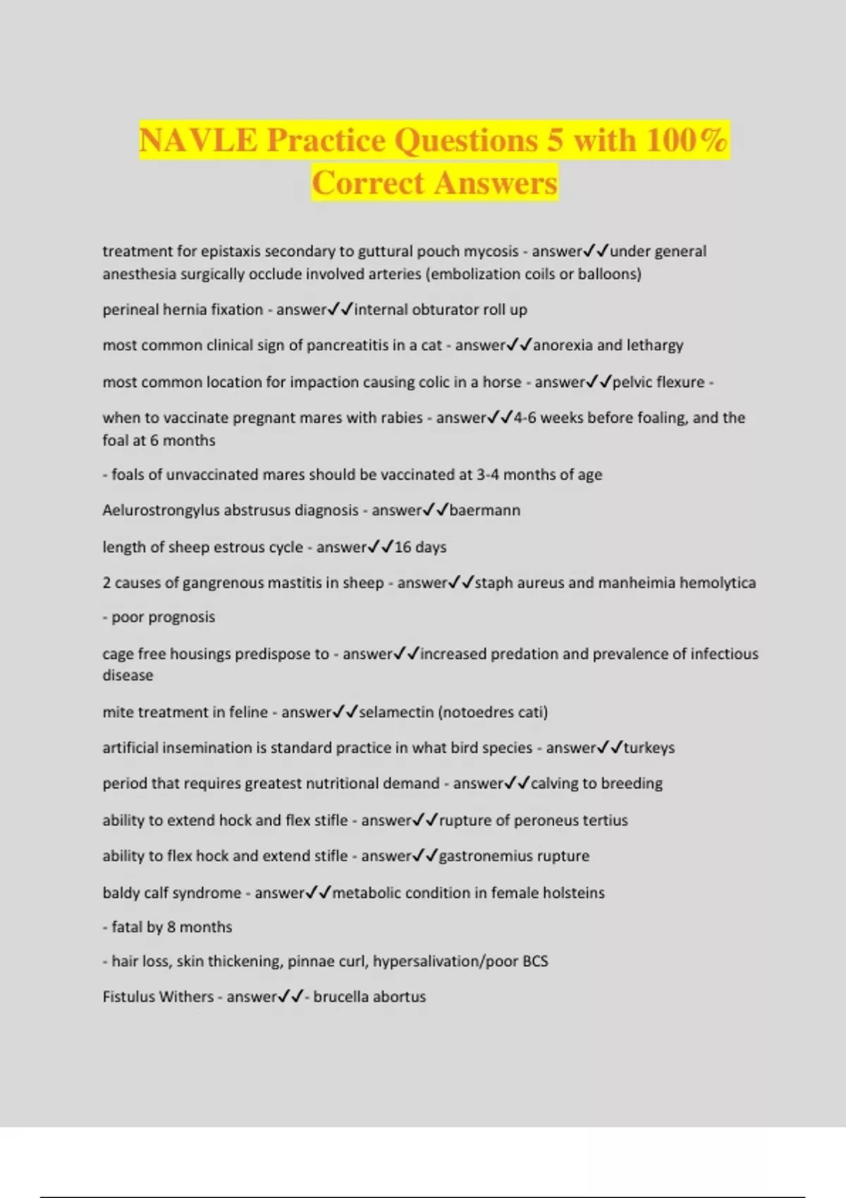 NAVLE Practice Questions 5 with 100% Correct Answers treatment for epistaxis secondary to guttural pouch mycosis - answerunder general anesthesia surgically occlude involved arteries (embolization coils or balloons) perineal hernia fixation - answerinternal obturator roll up most common clinical sign of pancreatitis in a cat - answeranorexia and lethargy most common location for impaction causing colic in a horse - answerpelvic flexure - when to vaccinate pregnant mares with rabies - answer4-6 weeks before foaling, and the foal at 6 months - foals of unvaccinated mares should be vaccinated at 3-4 months of age Aelurostrongylus abstrusus diagnosis - answerbaermann length of sheep estrous cycle - answer16 days 2 causes of gangrenous mastitis in sheep - answerstaph aureus and manheimia hemolytica - poor prognosis cage free housings predispose to - answerincreased predation and prevalence of infectious disease mite treatment in feline - answerselamectin (notoedres cati) artificial insemination is standard practice in what bird species - answerturkeys period that requires greatest nutritional demand - answercalving to breeding ability to extend hock and flex stifle - answerrupture of peroneus tertius ability to flex hock and extend stifle - answergastronemius rupture baldy calf syndrome - answermetabolic con