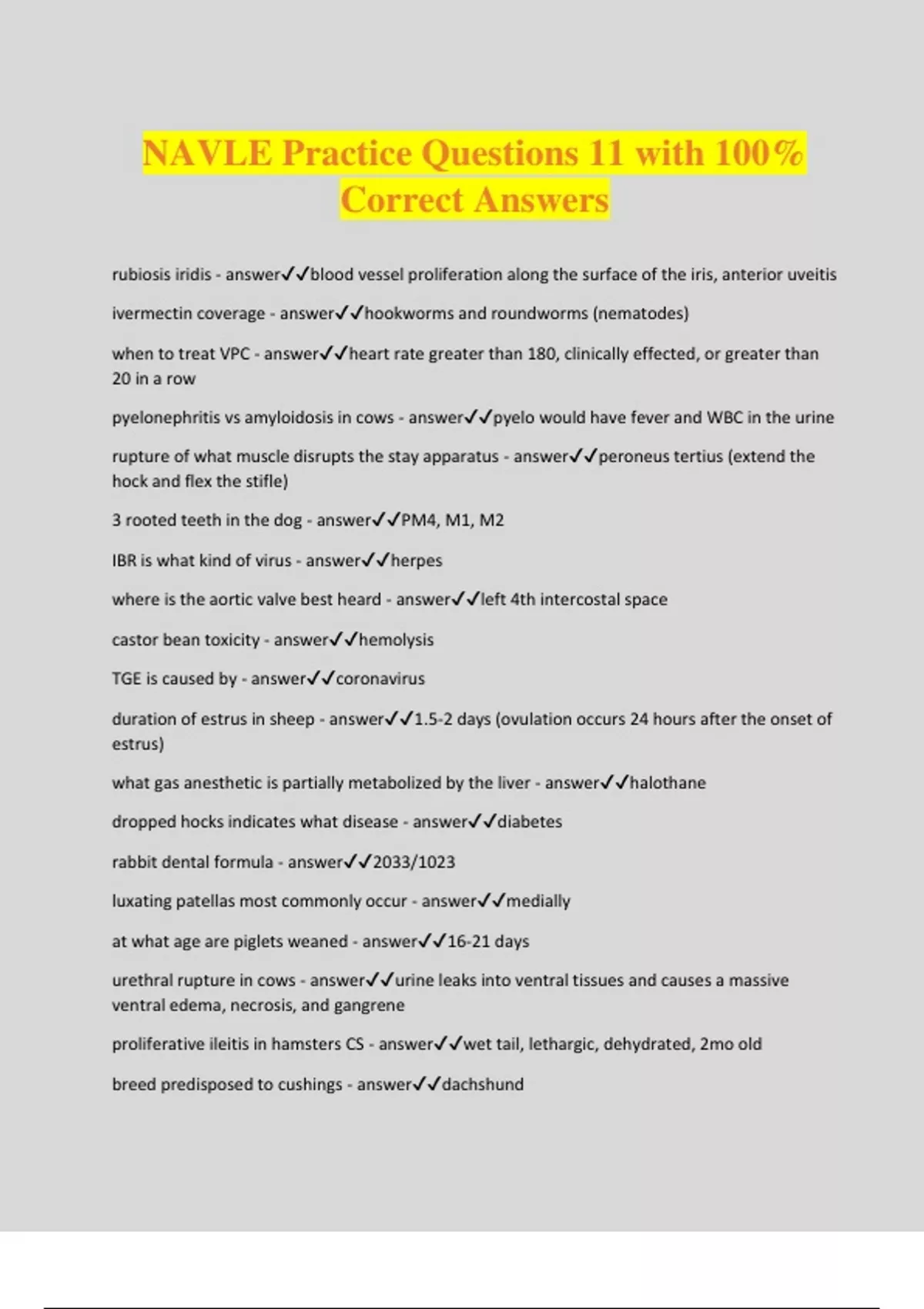 NAVLE Practice Questions 11 with 100% Correct Answers rubiosis iridis - answerblood vessel proliferation along the surface of the iris, anterior uveitis ivermectin coverage - answerhookworms and roundworms (nematodes) when to treat VPC - answerheart rate greater than 180, clinically effected, or greater than 20 in a row pyelonephritis vs amyloidosis in cows - answerpyelo would have fever and WBC in the urine rupture of what muscle disrupts the stay apparatus - answerperoneus tertius (extend the hock and flex the stifle) 3 rooted teeth in the dog - answerPM4, M1, M2 IBR is what kind of virus - answerherpes where is the aortic valve best heard - answerleft 4th intercostal space