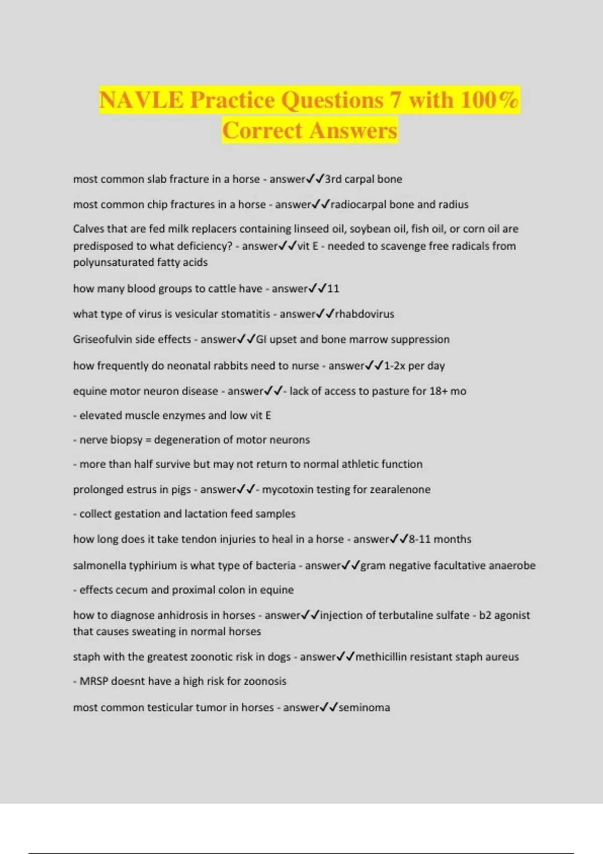 NAVLE Practice Questions 7 with 100% Correct Answers most common slab fracture in a horse - answer3rd carpal bone most common chip fractures in a horse - answerradiocarpal bone and radius Calves that are fed milk replacers containing linseed oil, soybean oil, fish oil, or corn oil are predisposed to what deficiency? - answervit E - needed to scavenge free radicals from polyunsaturated fatty acids how many blood groups to cattle have - answer11 what type of virus is vesicular stomatitis - answerrhabdovirus Griseofulvin side effects - answerGI upset and bone marrow suppression how frequently do neonatal rabbits need to nurse - answer1-2x per day equine motor neuron disease - answer- lack of access to pasture for 18+ mo - elevated muscle enzymes and low vit E - nerve biopsy = degeneration of motor neurons - more than half survive but may not return to normal athletic function prolonged estrus in pigs - answer- mycotoxin testing for zearalenone - collect gestation and lactation feed samples how long does it take tendon injuries to heal in a horse - answer8-11 months salmonella typhirium is what type of bacteria - answergram negative facultative anaerobe - effects cecum and proximal colon in equine how to diagnose anhidrosis in horses - answerinjection of terbutaline sulfate - b2 agonist that causes sweating in normal horses staph with the greatest zoonotic risk in dogs - answermethicillin resistant staph aureus - MRSP doesnt have a high risk for zoonosis most common testicular tumor in horses - answerseminoma