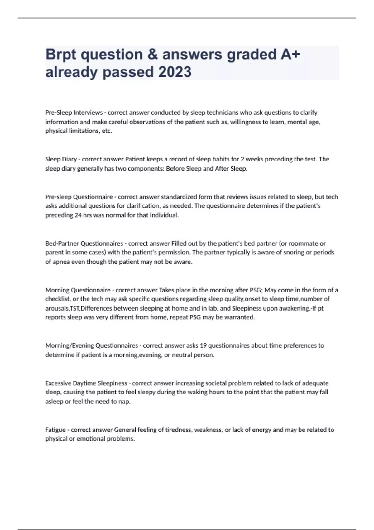 Brpt questions with complete solution 2024/2025Pre-Sleep Interviews - correct answer conducted by sleep technicians who ask questions to clarify information and make careful observations of the patient such as, willingness to learn, mental age, physical limitations, etc. Sleep Diary - correct answer Patient keeps a record of sleep habits for 2 weeks preceding the test. The sleep diary generally has two components: Before Sleep and After Sleep. Pre-sleep Questionnaire - correct answer standardized form that reviews issues related to sleep, but tech asks additional questions for clarification, as needed. The questionnaire determines if the patient's preceding 24 hrs was normal for that individual. Bed-Partner Questionnaires - correct answer Filled out by the patient's bed partner (or roommate or parent in some cases) with the patient's permission. The partner typically is aware of snoring or periods of apnea even though the patient may not be aware. Morning Questionnaire - correct answer Takes place in the morning after PSG; May come in the form of a checklist, or the tech may ask specific questions regarding sleep quality,onset to sleep time,number of arousals,TST,Differences between sleeping at home and in lab, and Sleepiness upon awakening.-If pt reports sleep was very different from home, repeat PSG may be warranted. Morning/Evening Questionnaires - correct answer asks 19 questionnaires about time preferences to determine if patient is a morning,evening, or neutral person. Excessive Daytime Sleepin