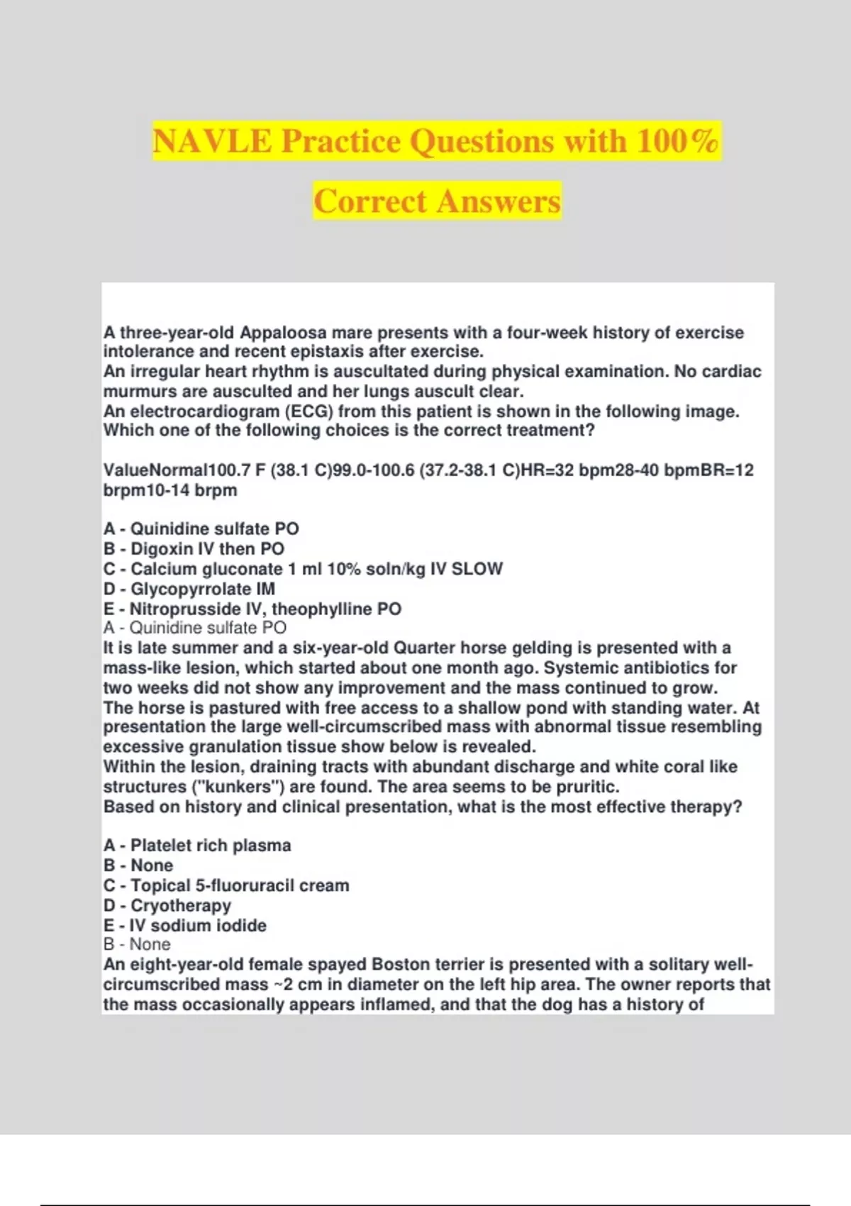 NAVLE Practice Questions with 100% Correct Answers A three-year-old Appaloosa mare presents with a four-week history of exercise intolerance and recent epistaxis after exercise. An irregular heart rhythm is auscultated during physical examination. No cardiac murmurs are ausculted and her lungs auscult clear. An electrocardiogram (ECG) from this patient is shown in the following image. Which one of the following choices is the correct treatment? ValueNormal100.7 F (38.1 C)99.0-100.6 (37.2-38.1 C)HR=32 bpm28-40 bpmBR=12 brpm10-14 brpm A - Quinidine sulfate PO B - Digoxin IV then PO C - Calcium gluconate 1 ml 10% soln/kg IV SLOW D - Glycopyrrolate IM E - Nitroprusside IV, theophylline PO A - Quinidine sulfate PO It is late summer and a six-year-old Quarter horse gelding is presented with a mass-like lesion, which started about one month ago. Systemic antibiotics for two weeks did not show any improvement and the mass continued to grow. The horse is pastured with free access to a shallow pond with standing water. At presentation the large well-circumscribed mass with abnormal tissue resembling excessive granulation tissue show below is revealed. Within the lesion, draining tracts with abundant discharge and white coral like structures ("kunkers") are found. The area seems to be pruritic. Based on history and clinical presentation, what is the most effective therapy? A - Platelet rich plasma B - None C - Topical 5-fluoruracil cream D - Cryotherapy E - IV sodium iodide B - None An eight-year-old female spayed Boston terrier is presented with a solitary well- circumscribed mass ~2 cm in diameter on the left hip area. The owner reports that the mass occasionally appears inflamed, an