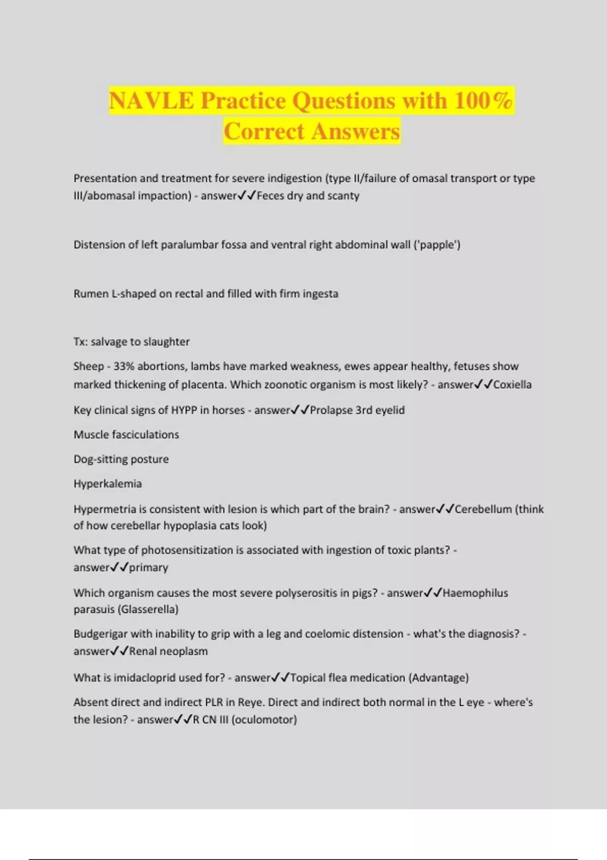 NAVLE Practice Questions with 100% Correct Answers Presentation and treatment for severe indigestion (type II/failure of omasal transport or type III/abomasal impaction) - answerFeces dry and scanty Distension of left paralumbar fossa and ventral right abdominal wall ('papple') Rumen L-shaped on rectal and filled with firm ingesta Tx: salvage to slaughter Sheep - 33% abortions, lambs have marked weakness, ewes appear healthy, fetuses show marked thickening of placenta. Which zoonotic organism is most likely? - answerCoxiella Key clinical signs of HYPP in horses - answerProlapse 3rd eyelid Muscle fasciculations Dog-sitting posture Hyperkalemia Hypermetria is consistent with lesion is which part of the brain? - answerCerebellum (think of how cerebellar hypoplasia cats look) What type of photosensitization is associated with ingestion of toxic plants? - answerprimary Which organism causes the most severe polyserositis in pigs? - answerHaemophilus parasuis (Glasserella) Budgerigar with inability to grip with a leg and coelomic distension - what's the diagnosis? - answerRenal neoplasm What is imidacloprid used for? - answerTopical flea medication (Advantage) Absent direct and indirect PLR in Reye. Direct and indirect both normal in the L eye - where's the lesion? - answerR CN III (oculomotor)