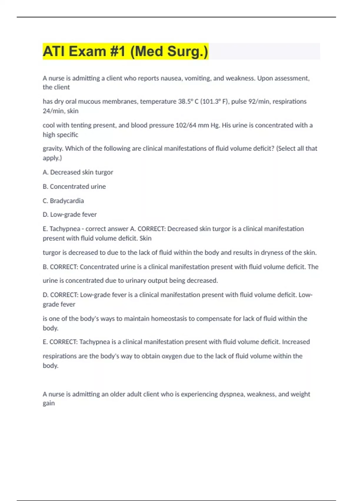 ATI Exam #1 (Med Surg.) A nurse is admitting a client who reports nausea, vomiting, and weakness. Upon assessment, the client has dry oral mucous membranes, temperature 38.5° C (101.3° F), pulse 92/min, respirations 24/min, skin cool with tenting present, and blood pressure 102/64 mm Hg. His urine is concentrated with a high specific gravity. Which of the following are clinical manifestations of fluid volume deficit? (Select all that apply.) A. Decreased skin turgor B. Concentrated urine C. Bradycardia D. Low-grade fever E. Tachypnea - correct answer A. CORRECT: Decreased skin turgor is a clinical manifestation present with fluid volume deficit. Skin