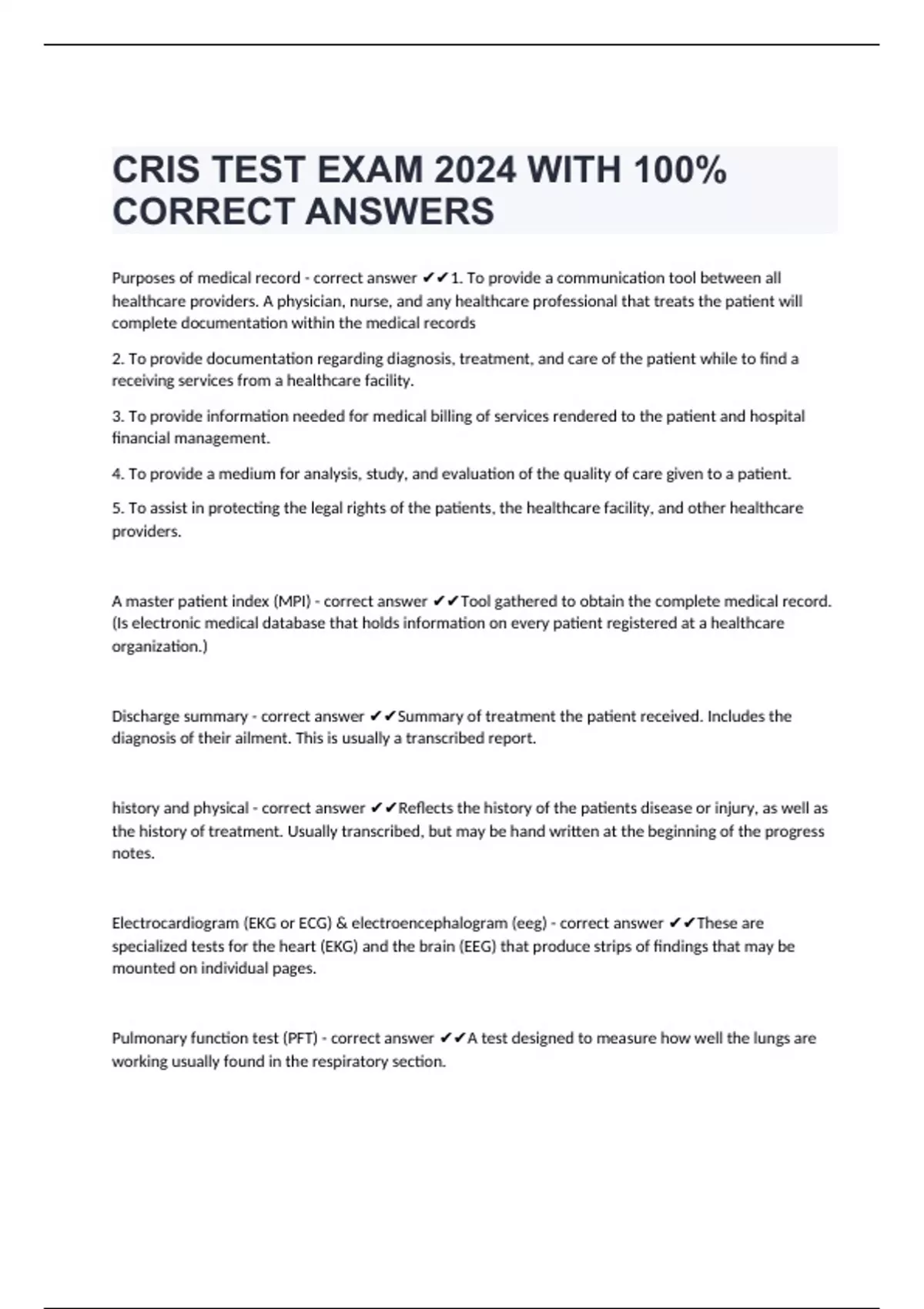 Purposes of medical record - correct answer 1. To provide a communication tool between all healthcare providers. A physician, nurse, and any healthcare professional that treats the patient will complete documentation within the medical records 2. To provide documentation regarding diagnosis, treatment, and care of the patient while to find a receiving services from a healthcare facility. 3. To provide information needed for medical billing of services rendered to the patient and hospital financial management. 4. To provide a medium for analysis, study, and evaluation of the quality of care given to a patient. 5. To assist in protecting the legal rights of the patients, the healthcare facility, and other healthcare providers. A master patient index (MPI) - correct answer Tool gathered to obtain the complete medical record. (Is electronic medical database that holds information on every patient registered at a healthcare organization.) Discharge summary - correct answer Summary of treatment the patient received. Includes the diagnosis of their ailment. This is usually a transcribed report. history and physical - correct answer Reflects the history of the patients disease or injury, as well as the history of treatment. Usually transcribed, but may be hand written at the beginning of the progress notes.
