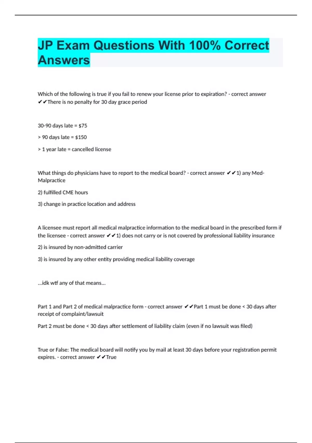 Which of the following is true if you fail to renew your license prior to expiration? - correct answer There is no penalty for 30 day grace period 30-90 days late = $75 > 90 days late = $150 > 1 year late = cancelled license What things do physicians have to report to the medical board? - correct answer 1) any Med-Malpractice 2) fulfilled CME hours 3) change in practice location and address A licensee must report all medical malpractice information to the medical board in the prescribed form if the licensee - correct answer 1) does not carry or is not covered by professional liability insurance 2) is insured by non-admitted carrier 3) is insured by any other entity providing medical liability coverage ...idk wtf any of that means... Part 1 and Part 2 of medical malpractice form - correct answer Part 1 must be done < 30 days after receipt of complaint/lawsuit