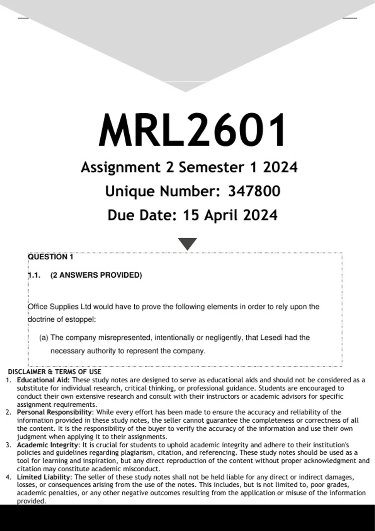 This document contains workings, explanations and solutions to the MRL2601 Assignment 2 (QUALITY ANSWERS) Semester 1 2024. For assistance call or us on 0.6.8..8.1.2..0.9.3.4........ Question 1 1.1 Lesedi and Simphiwe registered Furnmax (Pty) Ltd, a company that sells office equipment. The Memorandum of Incorporation of Furnmax (Pty) Ltd indicates that the board of directors, consisting of Lesedi, Simphiwe, Carol and Precious, can appoint a managing director who would be authorised to contract on the company’s behalf. However, the board has never formally appointed a managing director. Nevertheless, Lesedi, with the full knowledge of the other directors, has contracted with Office Supplies Ltd for the supply of office equipment to Furnmax (Pty) Ltd on two occasions. On the third occasion that Lesedi contracted with Office Supplies Ltd, Furnmax (Pty) Ltd denied liability for the payment for the equipment based on the fact that Lesedi was never appointed as the managing director. Upon being sued by Office Supplies Ltd, Furnmax (Pty) Ltd opposed the claim for payment in terms of the agreement based on the fact that Lesedi was not authorised to contract on the company’s behalf. Explain with reference to relevant case law what Office Supplies Ltd would have to prove in order to rely upon the doctrine of estoppel. (5) 1.2 Green Developments (Pty) Ltd (‘the company’) was incorporated and registered on 2 January 2024. According to its Memorandum of Incorporation the main purpose of the company is property development. The company’s board consists of five directors namely, Tanya, Johan, Moses, Samson and James. Prior to the incorporation of the company, Tanya concluded a written contract with Joe Foster in the name of the then to be incorporated company for the purchase of a fixed property in Midrand (‘the Midrand property’) at a price of R1 million. Since the company’s incorporation and registration, the company did not take any action in relation to the contract concluded by Tanya for the Midrand property. With reference to the Companies Act 71 of 2008 advise on the statutory requirements that must be met for the contract concluded by Tanya and Joe Foster to be binding on the company. (5) Question 2 2.1 Puseletso has recently bought the member’s interest in Gangnam’s Tile CC. She does not have experience of close corporations and approaches you for information on the important characteristics of a member’s interest in a close corporation. Advise Puseletso. (5) 4 2.2 Puseletso is experiencing financial problems, and it appears that she will be sequestrated. The other members of Gangnam’s Tile CC, who are aware of the situation, are concerned about what effect this will have on the continued existence of Gangnam’s Tile CC. With reference to the Close Corporations Act 69 of 1984 explain whether the continuation of the business will be affected by Puseletso’s sequestration and what happens to the member’s interest of a member of a close corporation when she is sequestrated. (5)