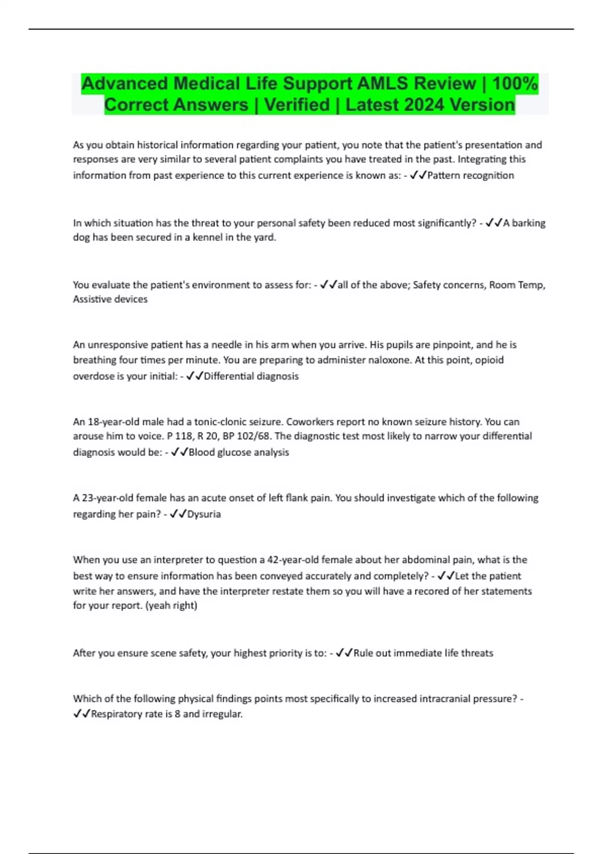 Advanced Medical Life Support AMLS Review | 100% Correct Answers | Verified | Latest 2024 Version