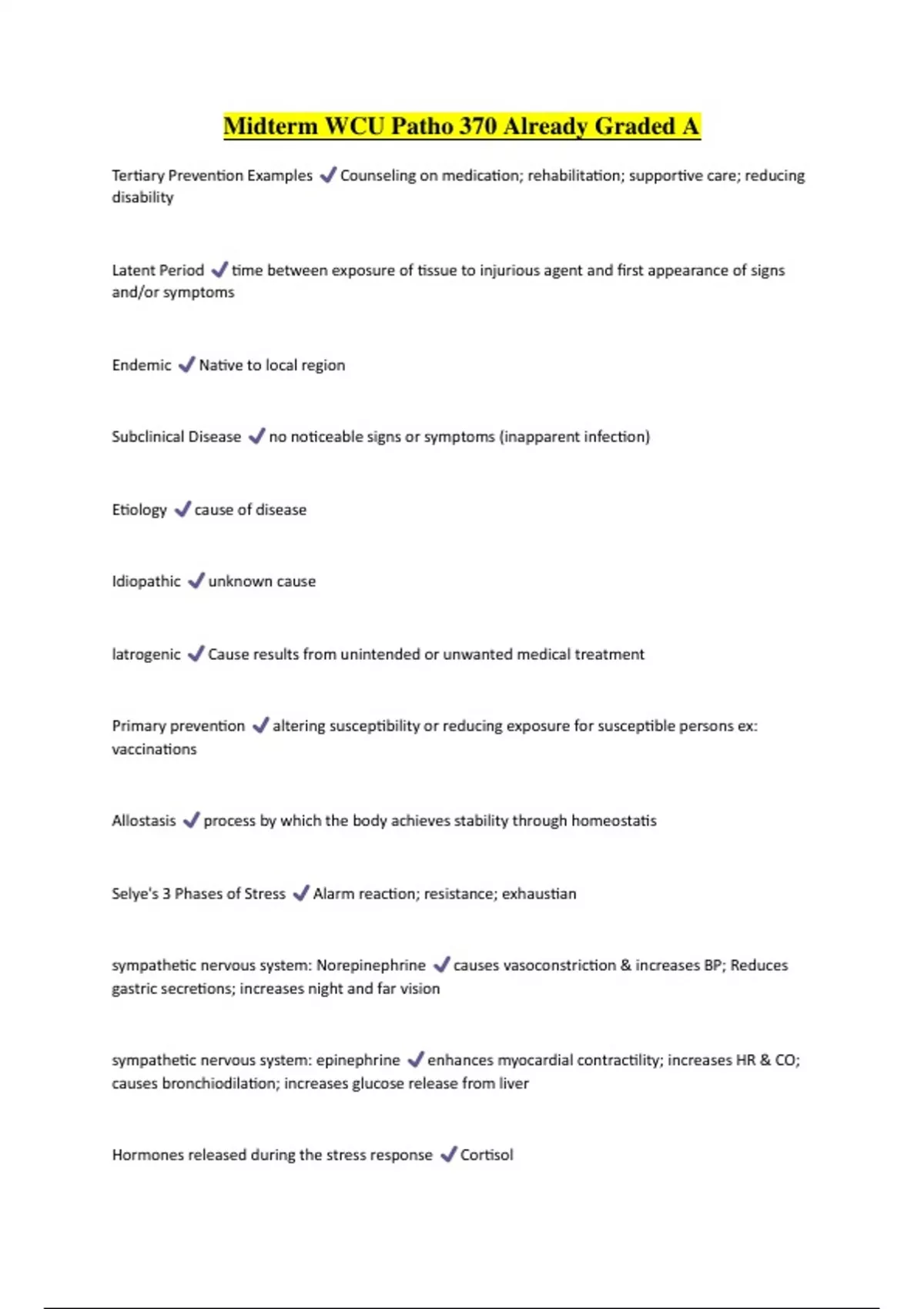 Midterm WCU Patho 370 Already Graded A Tertiary Prevention Examples disability Latent Period Counseling on medication; rehabilitation; supportive care; reducing t ime between exposure of tissue to injurious agent and first appearance of signs and/or symptoms Endemic Native to local region Subclinical Disease Etiology no noticeable signs or symptoms (inapparent infection) cause of disease Idiopathic latrogenic unknown cause Cause results from unintended or unwanted medical treatment Primary prevention vaccinations Allostasis altering susceptibility or reducing exposure for susceptible persons ex: process by which the body achieves stability through homeostatis Selye's 3 Phases of Stress Alarm reaction; resistance; exhaustian sympathetic nervous system: Norepinephrine gastric secretions; increases night and far vision sympathetic nervous system: epinephrine causes vasoconstriction & increases BP; Reduces enhances myocardial contractility; increases HR & CO; causes bronchiodilation; increases glucose release from liver Hormones released during the stress response Cortisol Antidiuretic Hormone (ADH) Norepinephrine Epinephrine Endorphines Oxytocin RAA pathway (renin-angiotensin-aldosterone) Types of intracellular accumulation -Excessive amounts of normal intracellular substance -Abnormal substances from faulty matabolism synthesis -particles that the cell is unable to degrade Cellular adaptation types -Atrophy: Decrease cell size -Hypertrophy: increase cell size -Hyperplasia: increase cell number -Metaplasia: conversion of one cell type to another -Dysplasia: disorderly growth Coagulative necrosis membrane (heart) Liquefactive necrosis this process begins with ischemia, ends with degradation of plasma liquification of lysosomal enzymes, formation of abscess or cyst from dissolved dead tissue (brain) Fat necrosis death of adipose tissue, appears as chalk white area ,usually due to trauma or pancreatitis (pancreas) Caseous Necrosis characteristic of lung damage secondary to tuberculosis (bacterial infection; resembles clumpy cheese (lung) Apoptosis programmed cell death Side effects of chemotherapy anemia nausea bleeding infections -oma tumor carcinoma sarcoma staging cancerous tumor (begins in kin or tissue that lines or covers body organs) malignant tumor (begins in bone or in soft tissue of the body) the process of classifying tumors with respect to how far the disease has progressed, the potential for its responding to therapy, and the patient's prognosis (stage 0 to 4) grading a way to classify cancer cells & is done by a pathologist Degree of malignancy & differentiation Low Grade (Grade I, II) High Grade (Grade III, IV) Deficits in immune system function in cancer cancer cells cancer metastasis to bone marrow malnutrition tumor marker functions chemotherapy help determine cancer origin help identify progression of cancer Hypersensitivity Type I strong genetic or herediatry linkage regarding IgE responses (allergens) immediate hypersensitivity release of histamine Hypersensitivity Type II t issue specific, cytotoxic, or cytolytic hypersensitivity occurs when antibodies attack antigens on surface of specific cells or tissues; causing lysis Ex: Transfusion reaction; hemolytic disease of newborn Hypersensitivity III immune complex reaction immune & phagocytic systems fail to effectively remove antigen-antibody immune complexes