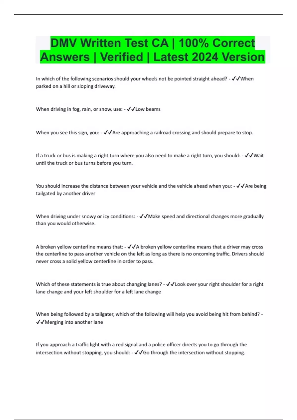 DMV Written Test CA | 100% Correct Answers | Verified | Latest 2024 Version