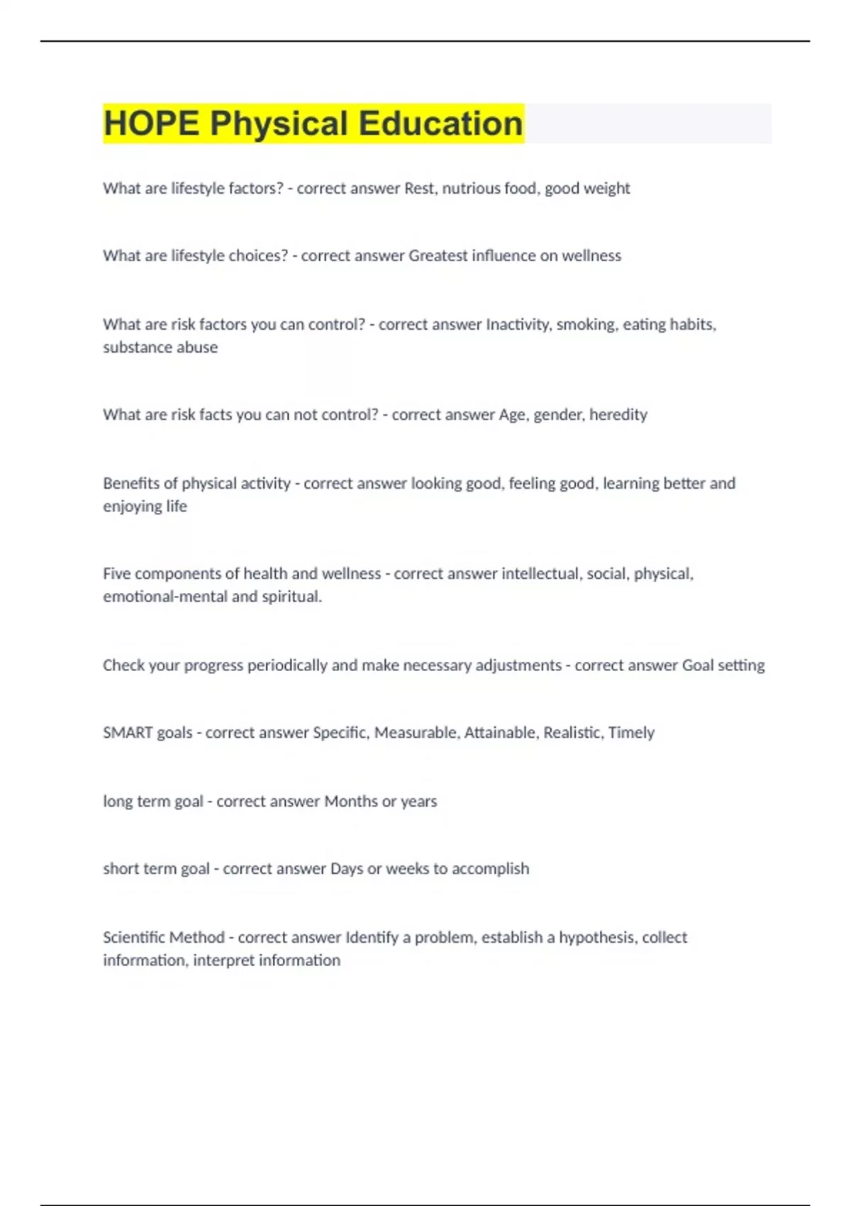 HOPE Physical Education FINA EXAM QUIZ STUDY GUIDE HOPE Physical Education What are lifestyle factors? - correct answer Rest, nutrious food, good weight What are lifestyle choices? - correct answer Greatest influence on wellness What are risk factors you can control? - correct answer Inactivity, smoking, eating habits, substance abuse What are risk facts you can not control? - correct answer Age, gender, heredity Benefits of physical activity - correct answer looking good, feeling good, learning better and enjoying life