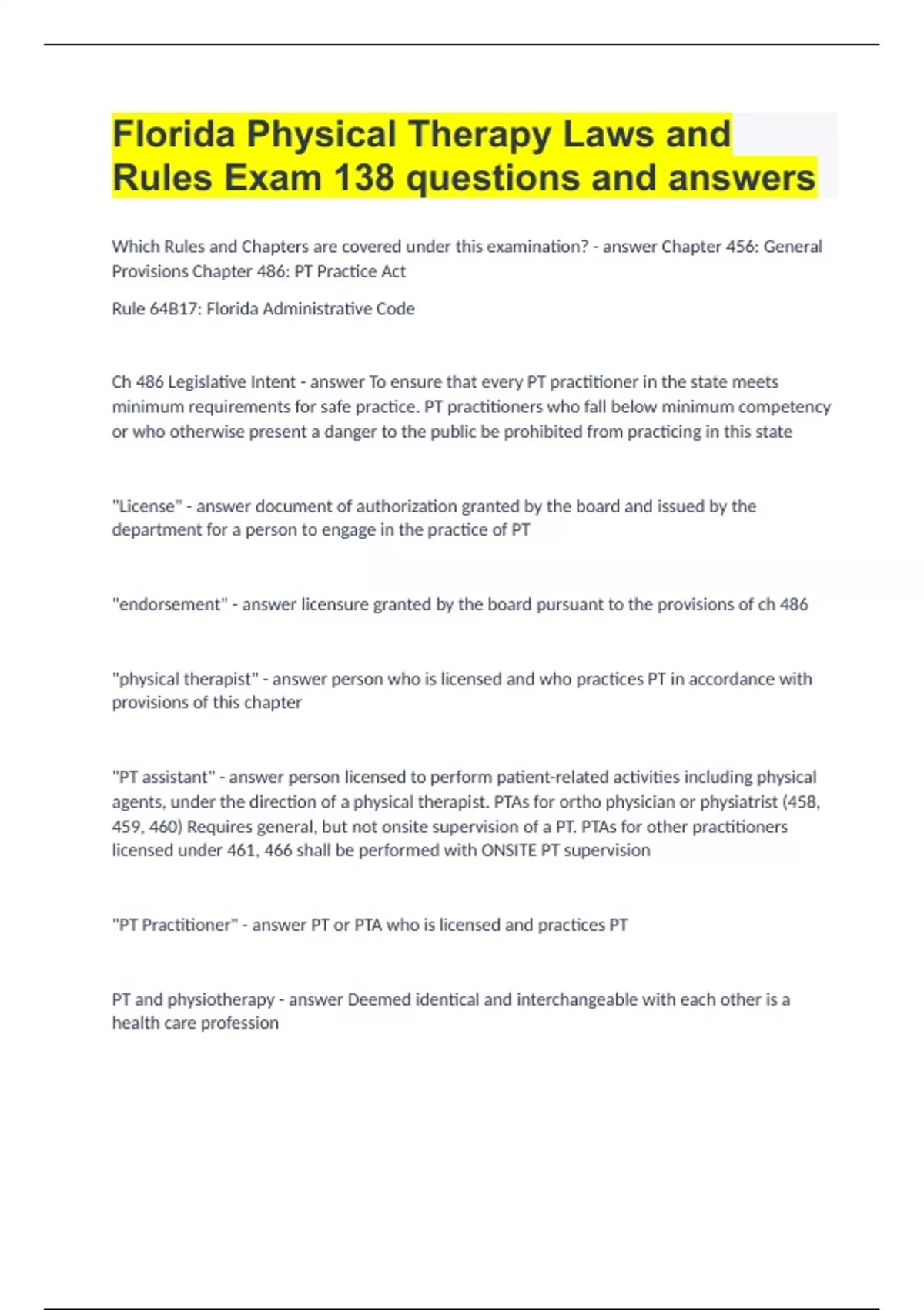 Florida Physical Therapy Laws and Rules Exam 138 questions and answers Which Rules and Chapters are covered under this examination? - answer Chapter 456: General Provisions Chapter 486: PT Practice Act Rule 64B17: Florida Administrative Code Ch 486 Legislative Intent - answer To ensure that every PT practitioner in the state meets minimum requirements for safe practice. PT practitioners who fall below minimum competency or who otherwise present a danger to the public be prohibited from practicing in this state "License" - answer document of authorization granted by the board and issued by the department for a person to engage in the practice of PT