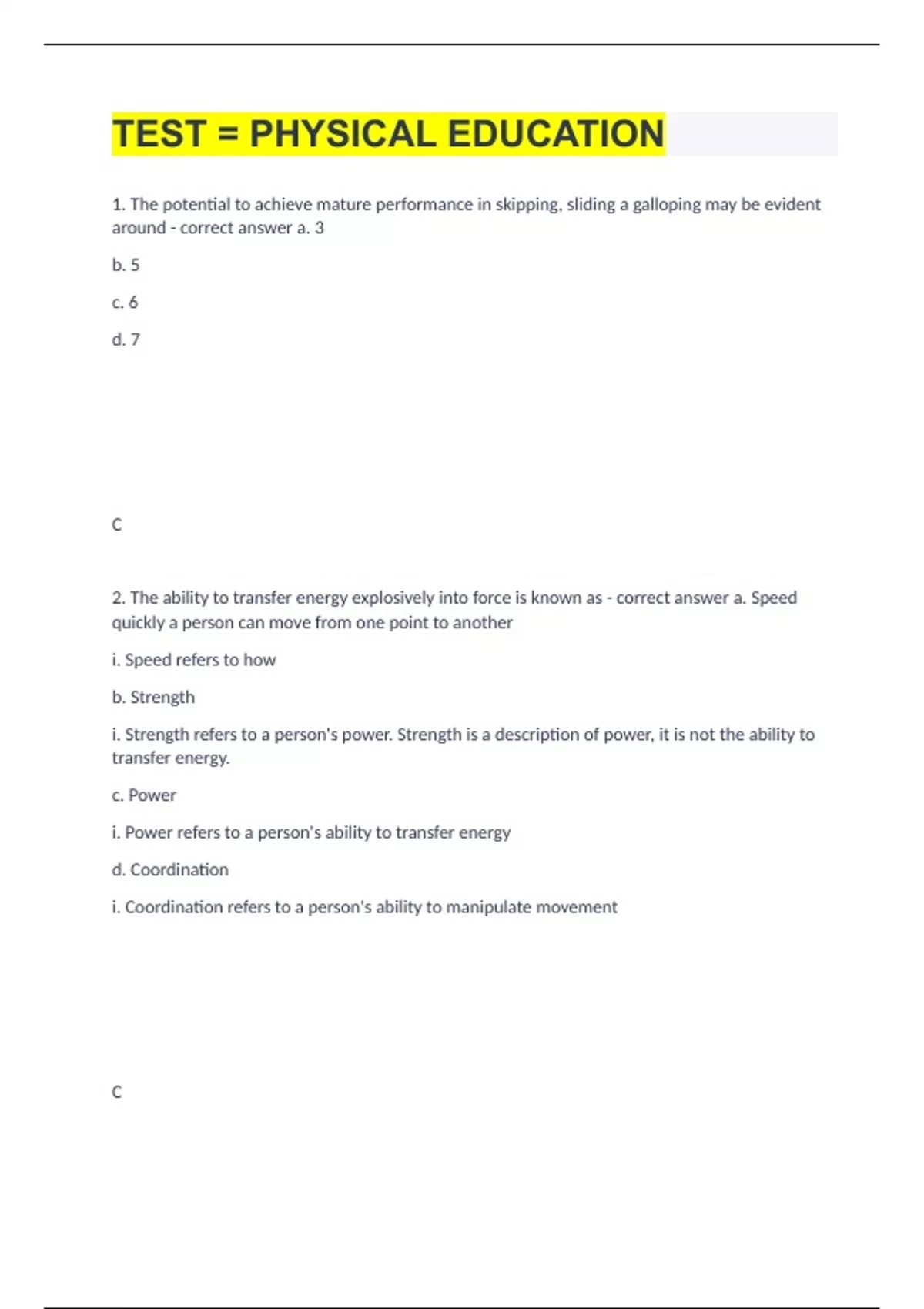 TEST Bank For PHYSICAL EDUCATION MULTIPLE CHOICES AND ANSWERS TEST = PHYSICAL EDUCATION 1. The potential to achieve mature performance in skipping, sliding a galloping may be evident around - correct answer a. 3 b. 5 c. 6 d. 7 2. The ability to transfer energy explosively into force is known as - correct answer a. Speed quickly a person can move from one point to another i. Speed refers to how b. Strength i. Strength refers to a person's power. Strength is a description of power, it is not the ability to transfer energy. c. Power i. Power refers to a person's ability to transfer energy d. Coordination i. Coordination refers to a person's ability to manipulate movement