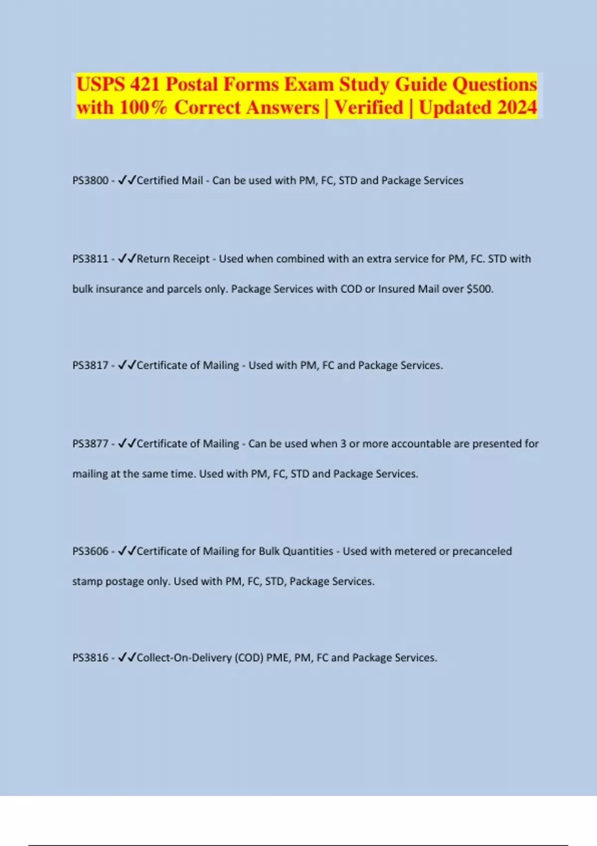 USPS 421 Postal Forms Exam Study Guide Questions with 100% Correct Answers | Verified | Updated 2024