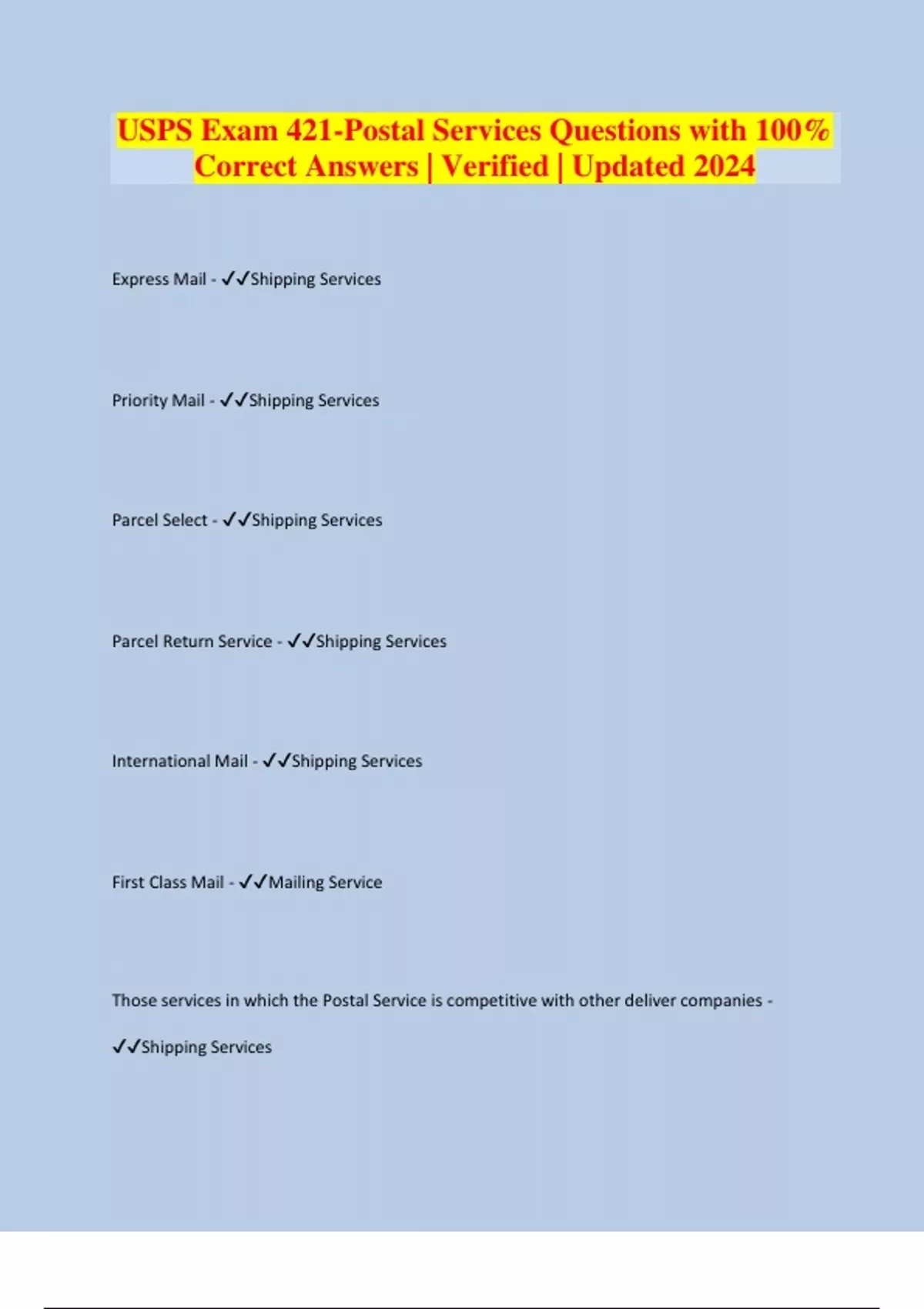 USPS Exam 421-Postal Services Questions with 100% Correct Answers | Verified | Updated 2024
