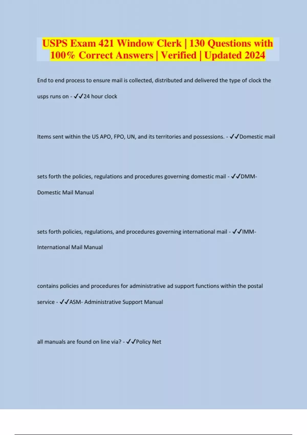 USPS Exam 421 Window Clerk | 130 Questions with 100% Correct Answers | Verified | Updated 2024