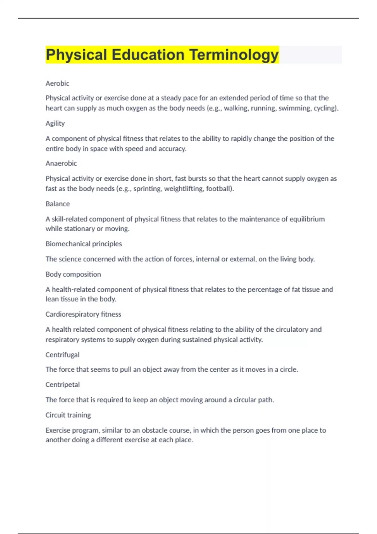 Physical Education Terminology Aerobic Physical activity or exercise done at a steady pace for an extended period of time so that the heart can supply as much oxygen as the body needs (e.g., walking, running, swimming, cycling). Agility A component of physical fitness that relates to the ability to rapidly change the position of the entire body in space with speed and accuracy. Anaerobic Physical activity or exercise done in short, fast bursts so that the heart cannot supply oxygen as fast as the body needs (e.g., sprinting, weightlifting, football). Balance A skill-related component of physical fitness that relates to the maintenance of equilibrium while stationary or moving.