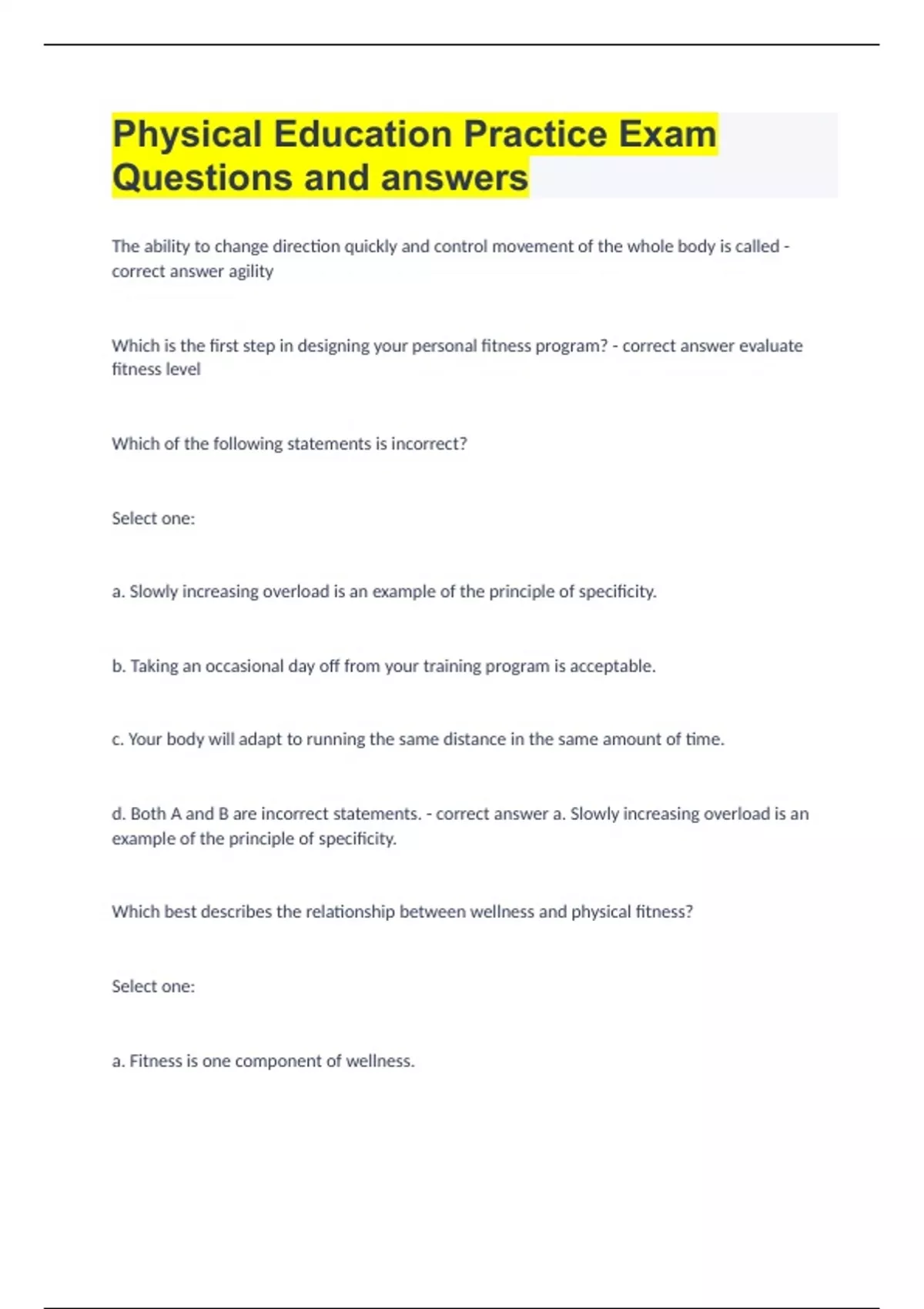 Physical Education Practice Exam Questions and answers The ability to change direction quickly and control movement of the whole body is called - correct answer agility Which is the first step in designing your personal fitness program? - correct answer evaluate fitness level Which of the following statements is incorrect? Select one: a. Slowly increasing overload is an example of the principle of specificity. b. Taking an occasional day off from your training program is acceptable. c. Your body will adapt to running the same distance in the same amount of time. d. Both A and B are incorrect statements. - correct answer a. Slowly increasing overload is an example of the principle of specificity.