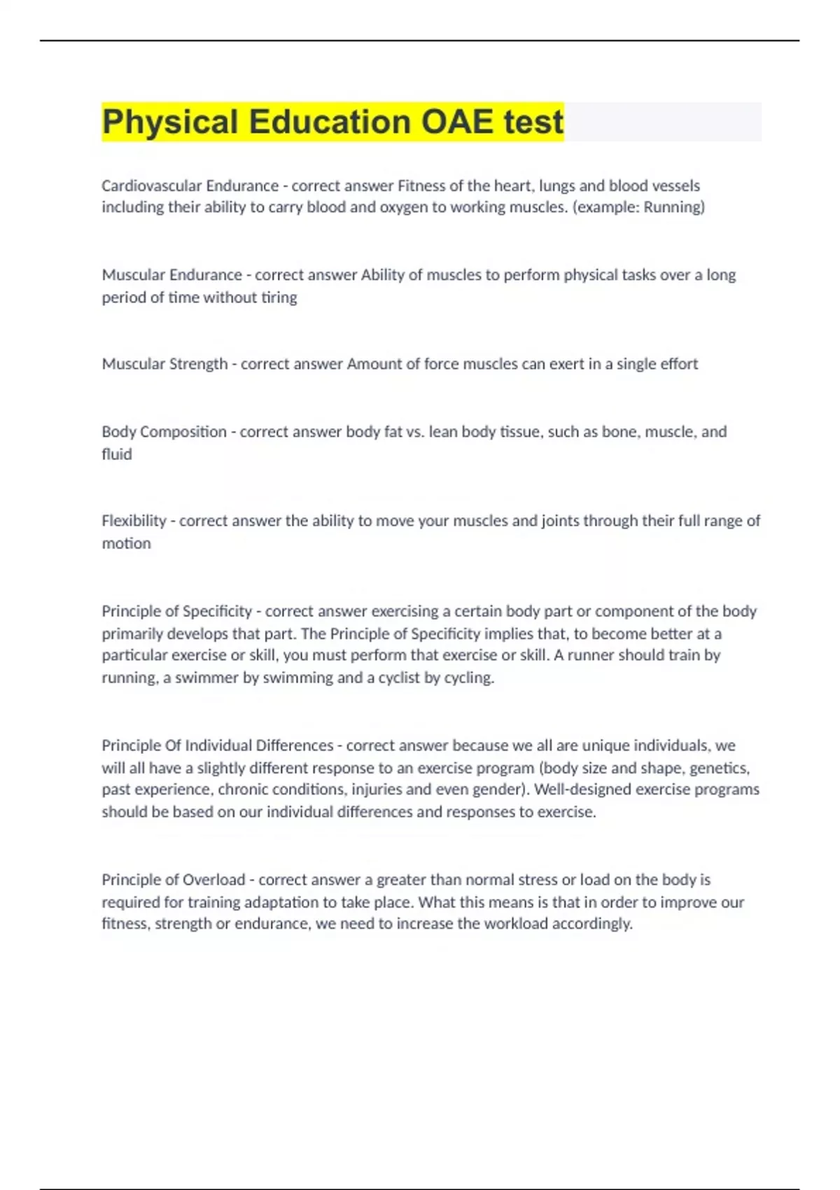 Physical Education OAE test Cardiovascular Endurance - correct answer Fitness of the heart, lungs and blood vessels including their ability to carry blood and oxygen to working muscles. (example: Running) Muscular Endurance - correct answer Ability of muscles to perform physical tasks over a long period of time without tiring Muscular Strength - correct answer Amount of force muscles can exert in a single effort Body Composition - correct answer body fat vs. lean body tissue, such as bone, muscle, and fluid