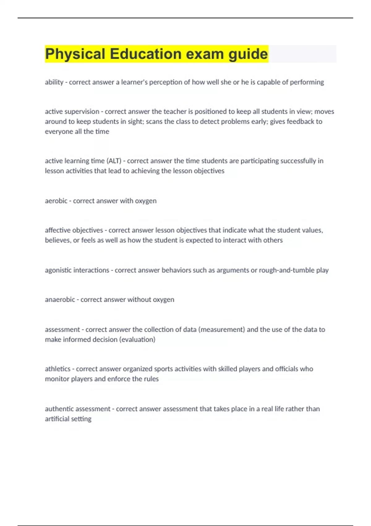 Physical Education Spring exam guide ability - correct answer a learner's perception of how well she or he is capable of performing active supervision - correct answer the teacher is positioned to keep all students in view; moves around to keep students in sight; scans the class to detect problems early; gives feedback to everyone all the time active learning time (ALT) - correct answer the time students are participating successfully in lesson activities that lead to achieving the lesson objectives aerobic - correct answer with oxygen affective objectives - correct answer lesson objectives that indicate what the student values, believes, or feels as well as how the student is expected to interact with others