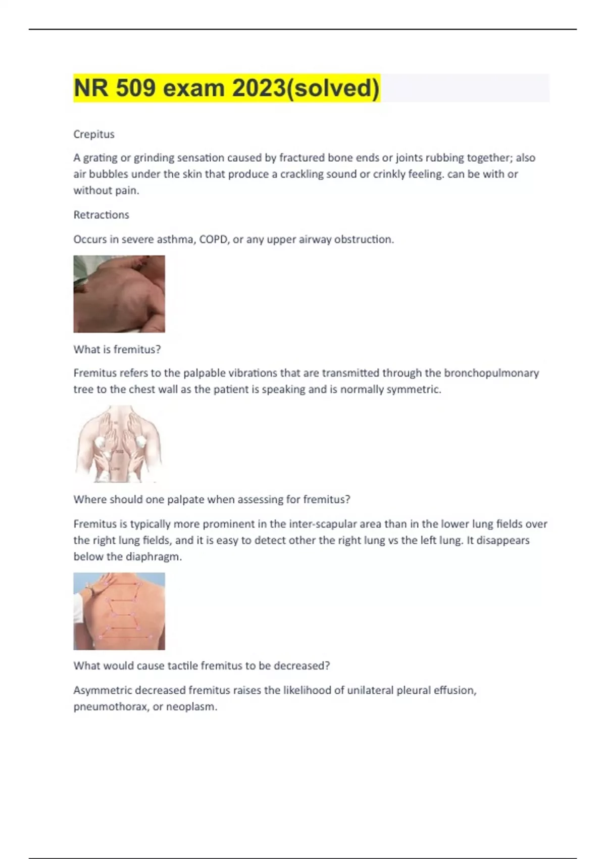 NR 509 exam 2023(solved) NR 509 Advanced Physical Assessment Crepitus A grating or grinding sensation caused by fractured bone ends or joints rubbing together; also air bubbles under the skin that produce a crackling sound or crinkly feeling. can be with or without pain. Retractions Occurs in severe asthma, COPD, or any upper airway obstruction. What is fremitus? Fremitus refers to the palpable vibrations that are transmitted through the bronchopulmonary tree to the chest wall as the patient is speaking and is normally symmetric.