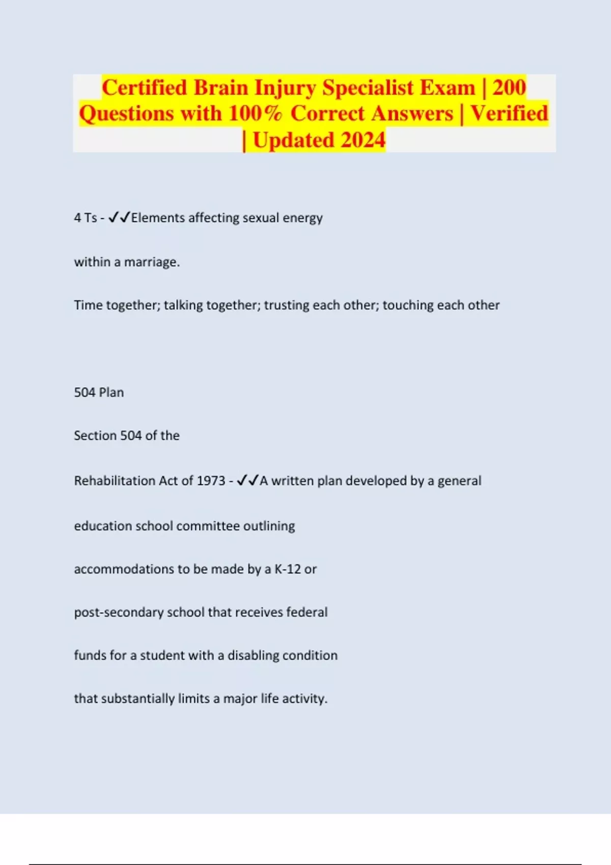 Certified Brain Injury Specialist Exam | 200 Questions with 100% Correct Answers | Verified | Updated 2024