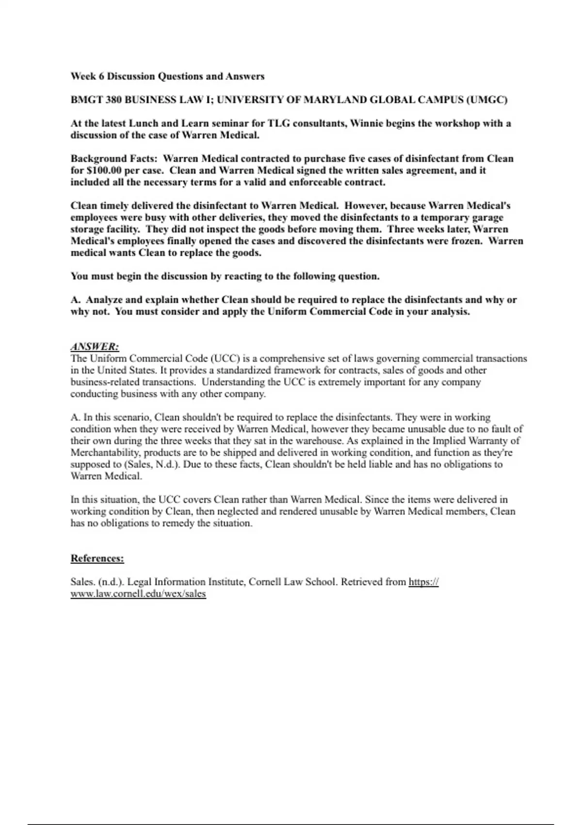 Discussion Questions and Answers for Weeks 1-3 & 6 for Business Law I (BMGT 380) at University of Maryland Global Campus (UMGC).
