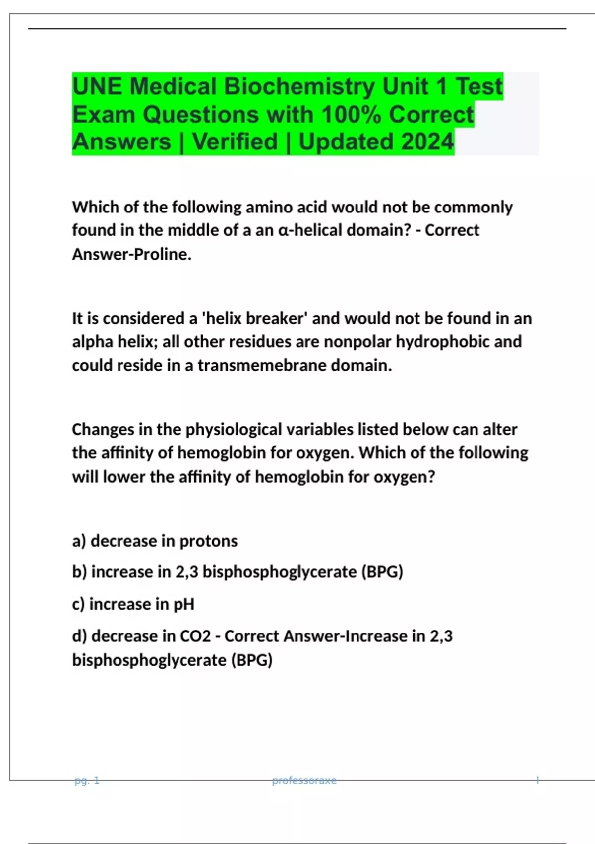UNE Medical Biochemistry Unit 1 Test Exam Questions with 100% Correct Answers | Verified | Updated 2024