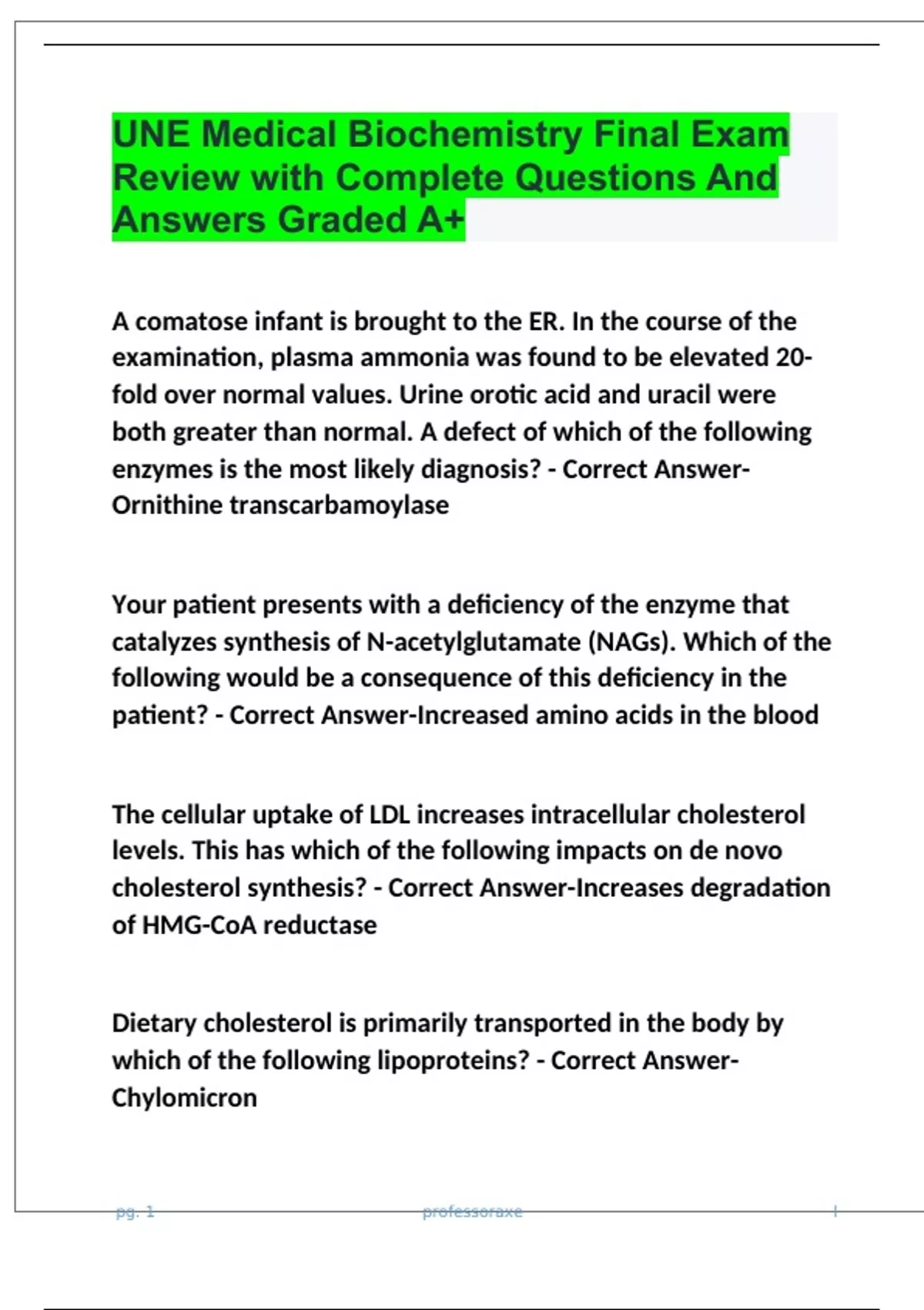 UNE Medical Biochemistry Final Exam Review with Complete Questions And Answers Graded A+