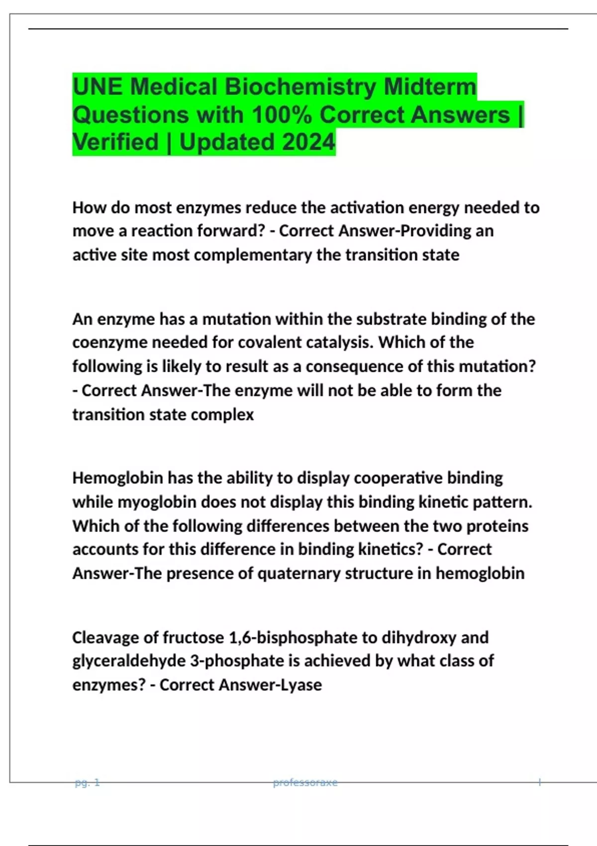 UNE Medical Biochemistry Midterm Questions with 100% Correct Answers | Verified | Updated 2024