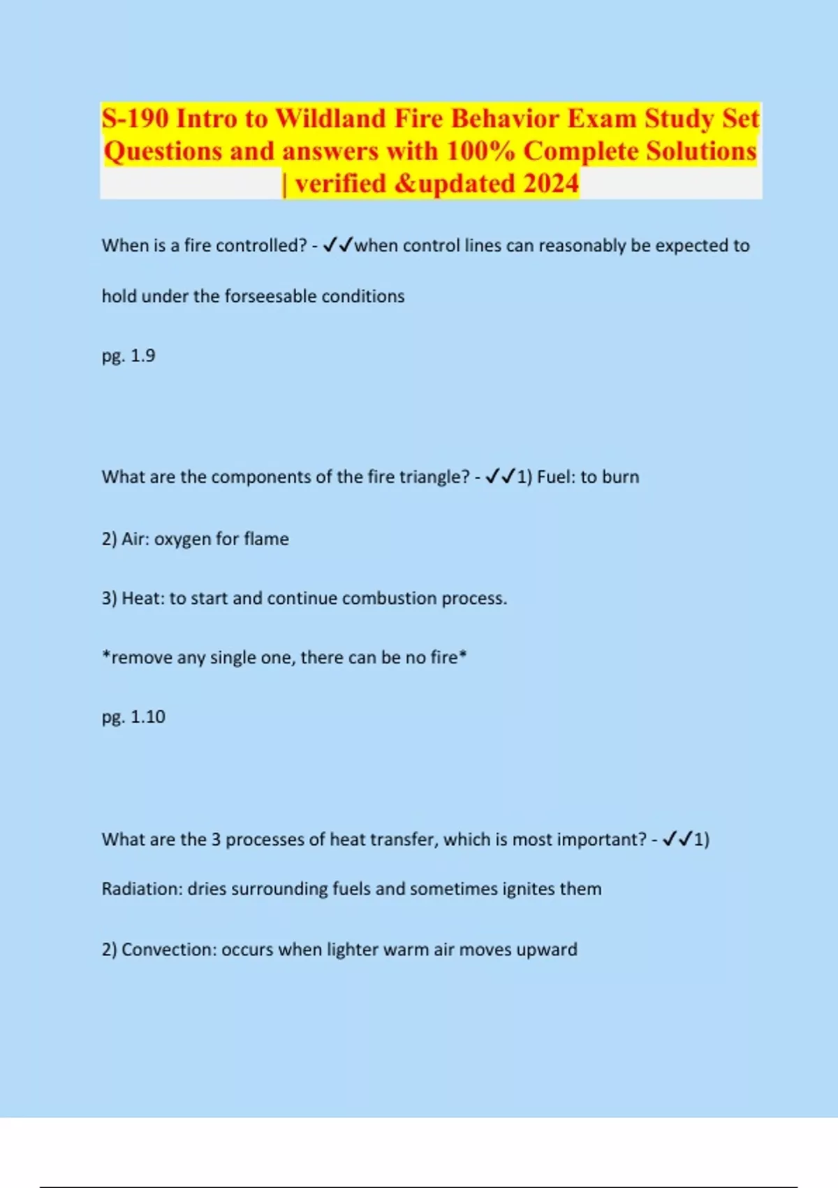 S-190 Intro to Wildland Fire Behavior Exam Study Set Questions and answers with 100% Complete Solutions | verified &updated 2024