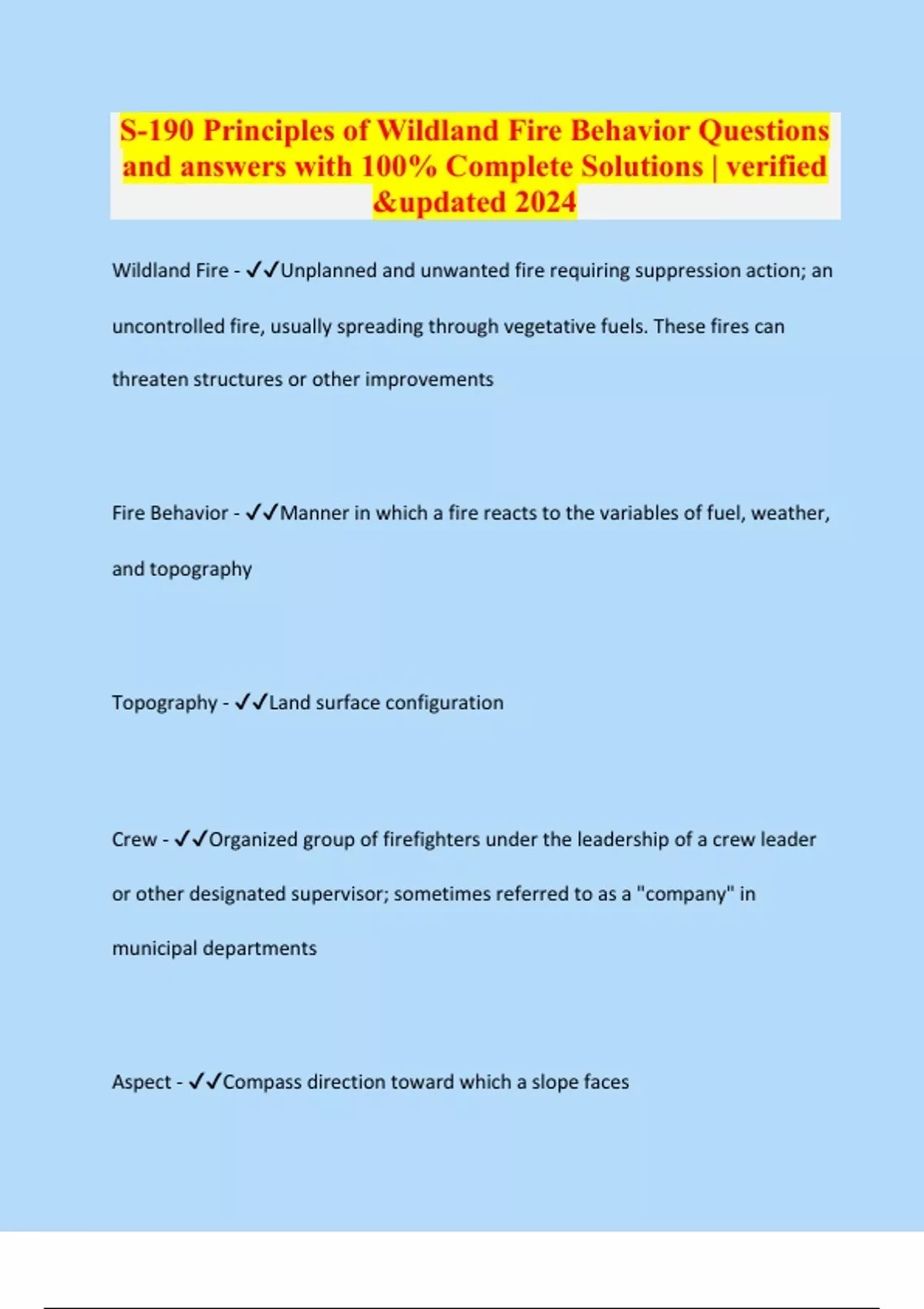 S-190 Principles of Wildland Fire Behavior Questions and answers with 100% Complete Solutions | verified &updated 2024