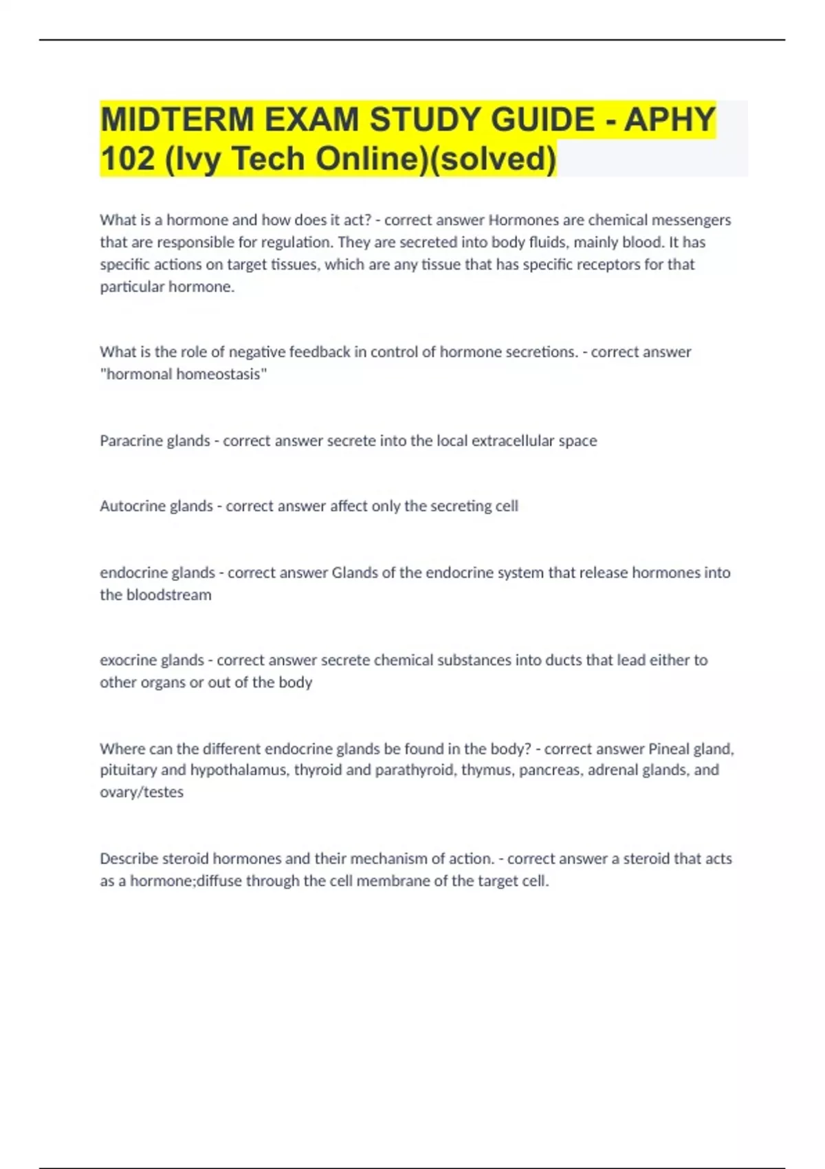 MIDTERM EXAM STUDY GUIDE - APHY 102 (Ivy Tech Online)(solved) What is a hormone and how does it act? - correct answer Hormones are chemical messengers that are responsible for regulation. They are secreted into body fluids, mainly blood. It has specific actions on target tissues, which are any tissue that has specific receptors for that particular hormone. What is the role of negative feedback in control of hormone secretions. - correct answer "hormonal homeostasis" Paracrine glands - correct answer secrete into the local extracellular space