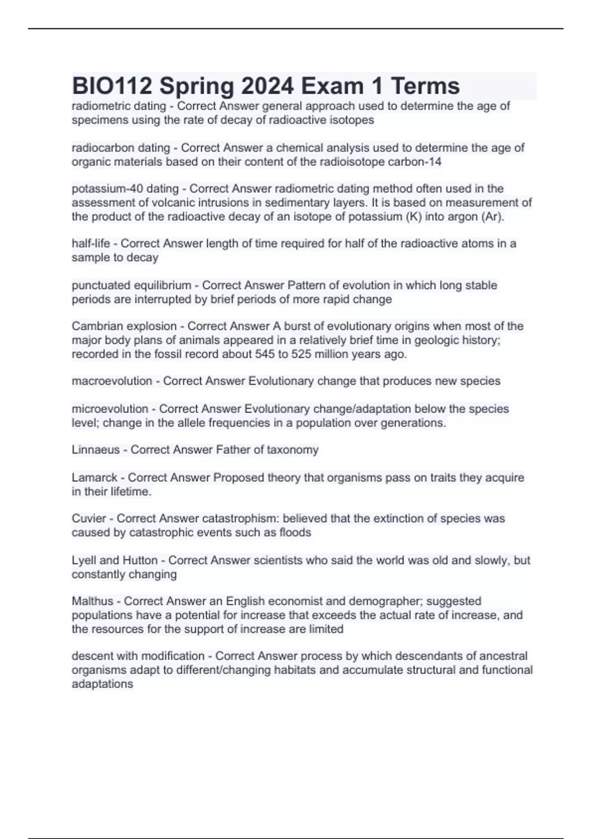 radiometric dating - Correct Answer general approach used to determine the age of specimens using the rate of decay of radioactive isotopes radiocarbon dating - Correct Answer a chemical analysis used to determine the age of organic materials based on their content of the radioisotope carbon-14 potassium-40 dating - Correct Answer radiometric dating method often used in the assessment of volcanic intrusions in sedimentary layers. It is based on measurement of the product of the radioactive decay of an isotope of potassium (K) into argon (Ar). half-life - Correct Answer length of time required for half of the radioactive atoms in a sample to decay punctuated equilibrium - Correct Answer Pattern of evolution in which long stable periods are interrupted by brief periods of more rapid change Cambrian explosion - Correct Answer A burst of evolutionary origins when most of the major body plans of animals appeared in a relatively brief time in geologic history; recorded in the fossil record about 545 to 525 million years ago. macroevolution - Correct Answer Evolutionary change that produces new species microevolution - Correct Answer Evolutionary change/adaptation below the species level; change in the allele frequencies in a population over generations. Linnaeus - Correct Answer Father of taxonomy Lamarck - Correct Answer Proposed theory that organisms pass on traits they acquire in their lifetime. Cuvier - Correct Answer catastrophism: believed that the extinction of species was caused by catastrophic events such as floods Lyell and Hutton - Correct Answer scientists who said the world was old and slowly, but constantly changing Malthus - Correct Answer an English economist and demographer; suggested populations have a potential for increase that exceeds the actual rate of increase, and the resources for the support of increase are limited descent with modification - Correct Answer process by which descendants of ancestral organisms adapt to different/changing habitats and accumulate structural and functional adaptations