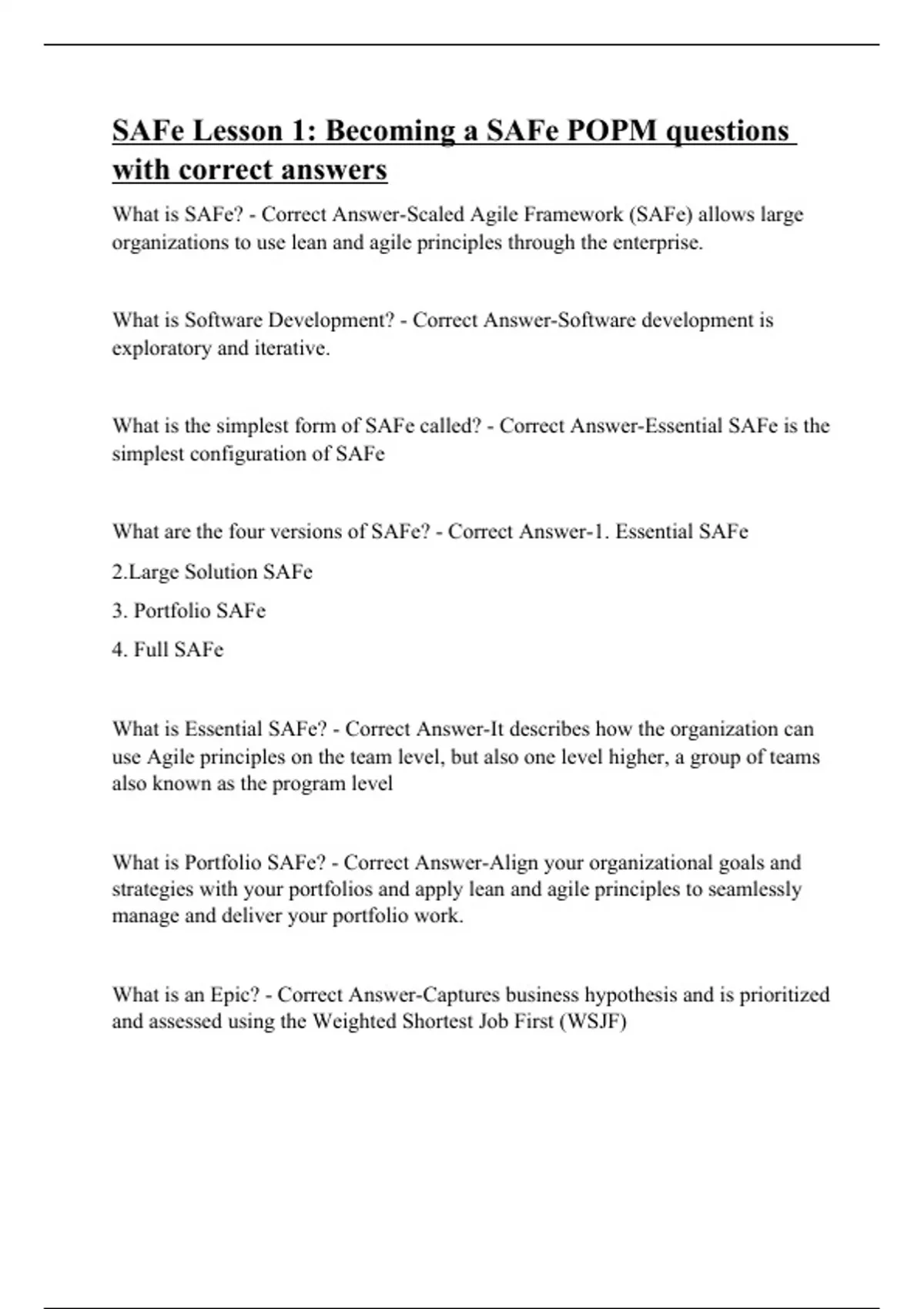 What is SAFe? - Correct Answer-Scaled Agile Framework (SAFe) allows large organizations to use lean and agile principles through the enterprise. What is Software Development? - Correct Answer-Software development is exploratory and iterative. What is the simplest form of SAFe called? - Correct Answer-Essential SAFe is the simplest configuration of SAFe What are the four versions of SAFe? - Correct Answer-1. Essential SAFe 2.Large Solution SAFe 3. Portfolio SAFe 4. Full SAFe What is Essential SAFe? - Correct Answer-It describes how the organization can use Agile principles on the team level, but also one level higher, a group of teams also known as the program level What is Portfolio SAFe? - Correct Answer-Align your organizational goals and strategies with your portfolios and apply lean and agile principles to seamlessly manage and deliver your portfolio work. What is an Epic? - Correct Answer-Captures business hypothesis and is prioritized and assessed using the Weighted Shortest Job First (WSJF)