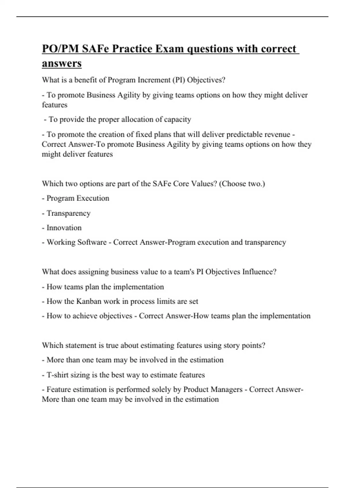 What is a benefit of Program Increment (PI) Objectives? - To promote Business Agility by giving teams options on how they might deliver features - To provide the proper allocation of capacity - To promote the creation of fixed plans that will deliver predictable revenue - Correct Answer-To promote Business Agility by giving teams options on how they might deliver features Which two options are part of the SAFe Core Values? (Choose two.) - Program Execution - Transparency - Innovation - Working Software - Correct Answer-Program execution and transparency What does assigning business value to a team's PI Objectives Influence? - How teams plan the implementation - How the Kanban work in process limits are set - How to achieve objectives - Correct Answer-How teams plan the implementation Which statement is true about estimating features using story points? - More than one team may be involved in the estimation - T-shirt sizing is the best way to estimate features - Feature estimation is performed solely by Product Managers - Correct Answer-More than one team may be involved