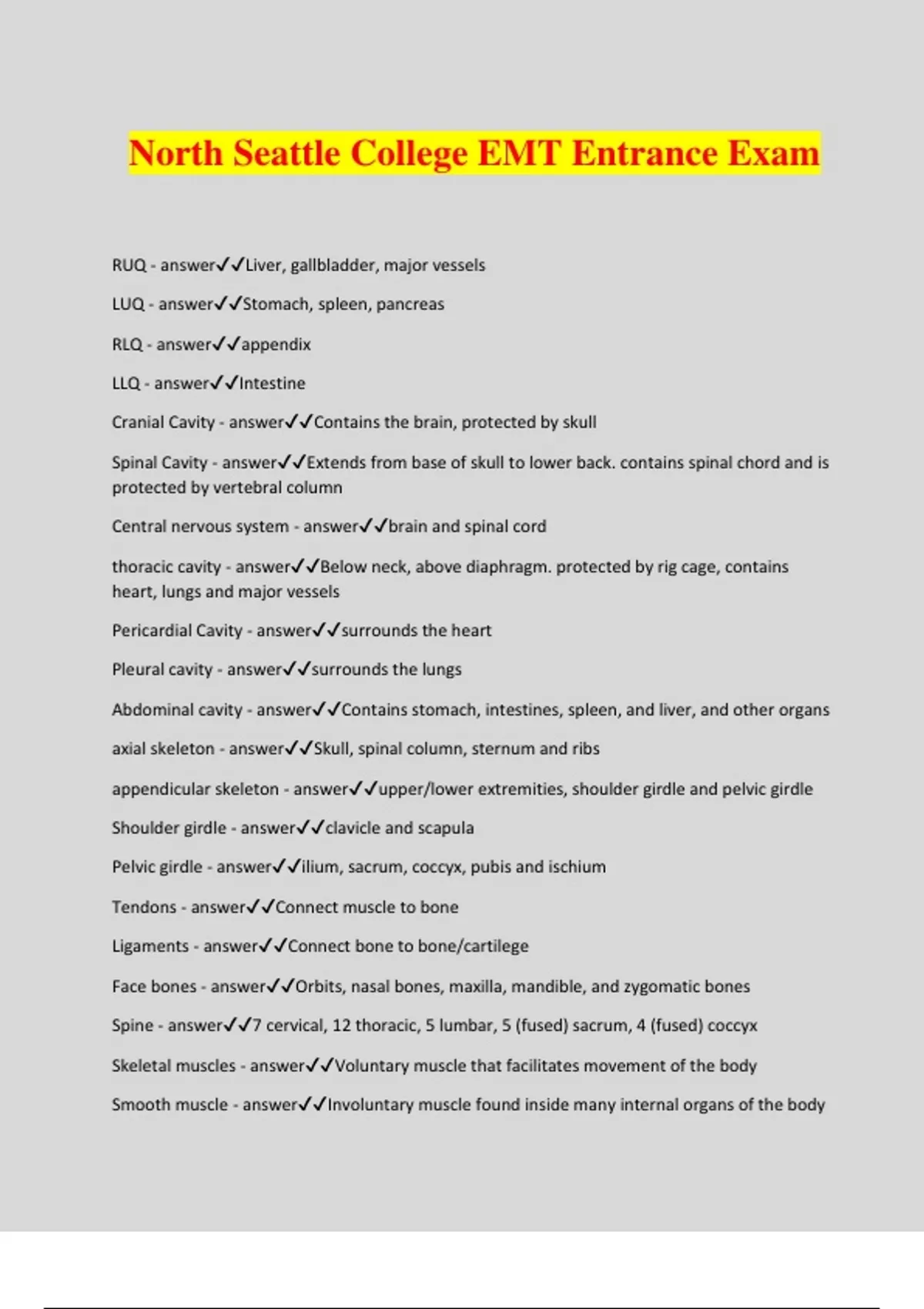 North Seattle College EMT Entrance Exam RUQ - answerLiver, gallbladder, major vessels LUQ - answerStomach, spleen, pancreas RLQ - answerappendix LLQ - answerIntestine Cranial Cavity - answerContains the brain, protected by skull Spinal Cavity - answerExtends from base of skull to lower back. contains spinal chord and is protected by vertebral column Central nervous system - answerbrain and spinal cord thoracic cavity - answerBelow neck, above diaphragm. protected by rig cage, contains heart, lungs and major vessels Pericardial Cavity - answersurrounds the heart Pleural cavity - answersurrounds the lungs Abdominal cavity - answerContains stomach, intestines, spleen, and liver, and other organs axial skeleton - answerSkull, spinal column, sternum and ribs appendicular skeleton - answerupper/lower extremities, shoulder girdle and pelvic girdle Shoulder girdle - answerclavicle and scapula Pelvic girdle - answerilium, sacrum, coccyx, pubis and ischium Tendons - answerConnect muscle to bone Ligaments - answerConnect bone to bone/cartilege Face bones - answerOrbits, nasal bones, maxilla, mandible, and zygomatic bones Spine - answer7 cervical, 12 thoracic, 5 lumbar, 5 (fused) sacrum, 4 (fused) coccyx Skeletal muscles - answerVoluntary muscle that facilitates movement of the body Smooth muscle - answerInvoluntary muscle found inside many internal organs of the body cardiac muscle - answerInvoluntary muscle tissue found only in the heart. Upper airway - answerNose, pharynx, larynx Lower airway - answertrachea, lungs, bronchi, bronchioles, alveoli Sinuses - answerProduce mucus and trap bacteria Pharynx - answerthroat Nasopharynx - answerregion of the pharynx at the back of the nose and above the soft palate Oropharynx - answercentral portion of the pharynx between the roof of the mouth and the upper edge of the epiglottis Laryngopharynx - answerLower throat that surrounds openings of esophagus and larynx Larynx - answerConnects pharynx with trachea. Voice box Thyroid cartilage - answeradams apple, the largest cartilage of the larynx Hyoid bone - answera U-shaped bone in the neck that supports the tongue. Epiglottis - answerA flap of tissue that seals off the windpipe and prevents food from entering. Trachea - answerWindpipe that continues to chest and branches into right and left primary bronchus Alveoli - answertiny sacs of lung tissue specialized for the movement of gases between air and blood Right Lung - answerSpongy, air-filled organ with 3 lobes Left lung - answerSpongy, air-filled organ with 2 lobes and a cardiac notch Mediastinum - answerSpace in the middle of the chest between the lungs Pleurae - answerserous membranes that form an envelope between the lungs and the chest wall Intercostal muscles - answermuscles between the ribs that contract when breathing Diaphragm - answerMuscle below lungs. Main muscle of respiration and separates chest cavity from abdominal cavity Hemoglobin - answerPart of the red blood cell that acquires oxygen in the lungs Cardiovascular system - answerHeart, blood and blood vessels Lymphatic System - answerlymph, lymph nodes, lymph vessels, tonsils, spleen Great vessels - answer- Pulmonary Arteries/ veins - Aorta - Superior/ inferior vena cava Atria - answerupper chambers of the heart. Receive blood from body/lungs Ventricles - answerLower chambers of the heart with thick muscle to pump blood to the body Arteries - answercarry blood away from the heart Veins - answerBlood vessels that carry blood back to the heart Plasma - answerliquid portion of blood Arterioles - answerSmall vessels that connect arteries to capillaries Venules - answersmall vessels that gather blood from the capillaries into the veins Capillaries - answerMicroscopic vessel through which exchanges take place between the blood and cells of the bod