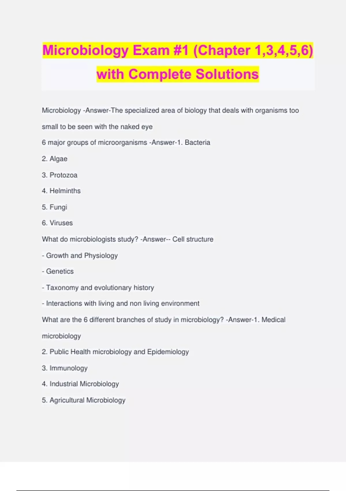 Microbiology Exam #1 (Chapter 1,3,4,5,6) with Complete Solutions Microbiology -Answer-The specialized area of biology that deals with organisms too small to be seen with the naked eye 6 major groups of microorganisms -Answer-1. Bacteria 2. Algae 3. Protozoa 4. Helminths 5. Fungi 6. Viruses What do microbiologists study? -Answer-- Cell structure - Growth and Physiology - Genetics - Taxonomy and evolutionary history - Interactions with living and non living environment What are the 6 different branches of study in microbiology? -Answer-1. Medical microbiology 2. Public Health microbiology and Epidemiology 3. Immunology 4. Industrial Microbiology 5. Agricultural Microbiology 6. Environmental Microbiology Medical Microbiology -Answer-Study of microbes as they relate to medicine, deals with microbes that causes disease in humans and animals Public Health Microbiology and Epidemiology -Answer-Monitor and control the spread of disease in communities. USPHS, CDC, WHO Industrial Microbiology -Answer-- Use of microbes to manufacture important compounds - Safeguards our food and water - Also includes biotechnology - Ranges from bread making to gene therapy - Microbes can be used to create large quantities of substances such as amino acids, beer, drugs, enzymes, and vitamins Agricultural Microbiology -Answer-- Deals with the relationships between microbes and domesticated plants and animals - Plant specialists focus on plant diseases, soil fertility, and nutritional interactions - Animal specialists work with infectious diseases and other associations animals have with microorganisms Immunology -Answer-Studies a diverse areas such as vaccination, blood testing, and allergy. Immunologists investigate the role of the immune system in cancer and autoimmune diseases Environmental Microbiology -Answer-Studies the effect of microbes on the earth's diverse habitats. Example- aquatic microbiology, soil microbiology, geomicrobiology, and astrobiology eu-kary means? -Answer-true nucleus; cells with a nucleus are classified as eukaryotes Pro-kary means? -Answer-Pre-nucleus; bacteria and archaea do not have a nucleus and have been traditionally classified as prokaryotes What is a microbe? -Answer-A microorganism How are biology and microbiology different? How are they similar? -Answer-Biology is concerned with all the different scales of size that microorganisms exist on, but many fields on biology are concerned with more complex organisms such as mammals. Microbiology is concerned specifically with smaller, individual organisms. Microbiologists might be concerned with something as big as a bacteria, and they do study systems, such as the immune system, but generally they focus on smaller individual organisms. They are similar because they both study organisms, just on different scales. Bacteria -Answer-- Unicellular microorganisms - Some cause human, animal, or plant diseases; others are beneficial. - Prokaryotic Algae -Answer-- Unicellular microorganisms - Prokaryotic - Food or water borne - Reproduce Asexually - Photosythetic Protozoa -Answer-- Unicellular - Eukaryotic - Live independently or as parasites - Mostly found in soil or water Helminths -Answer-- Multicellular - Eukaryotic - Worms Fungi/Yeast -Answer-- Eukaryotic - Multicellular - Protists characterized by the absence of chlorophyll and by the presence of a rigid cell wall Medical Microbiology -Answer-- Deals with diseases of humans and animals - Study the way microorganisms cause disease - Example: A Microbiologist at the CDC may examine a culture of the influenza virus in order to understand why is is so harmful Public Health Microbiology & Epidemiology -Answer-- Monitor and control the spread of diseases in communities - CDC, USPHS, & WHO - Example: Epidemiologists conduct interviews as a part of the effort to curb the cholera epidemic in Haiti Immunology -Answer-- Studies the web of protective substances and cells produced in response to infection - Vaccination, blood testing, and allergy - Immunologists investigate the role of the immune system in cancer and autoimmune diseases - Example: Immunologists freeze dry samples of infectious diseases Industrial Microbiology -Answer-- Branch of microbiology in which microbes are manipulated to manufacture useful products - Ranges from bread making to gene therapy - Safeguards our food and water - Microbes can be used to create large quantities of substances such as amino acids, berm drugs, enzymes and vitamins - Example: Scientists use a multispectural imaging systems for inspection of chickens to be manufactured Agricultural Microbiology -Answer-- Concerned with the relationship between microbes and domesticated plants and animals - Plant specialists focus on plant diseases, soil fertility, and nutritional interactions - Animal specialists focus on infectious diseases and other associations animals have with microorganisms Environmental Microbiology -Answer-- Studies the effect of microbes on the Earth's diverse habitats - 4 Types: Aquatic, Soil, Geo, and Astro - Studies microbes in the earths surface water, soil, crust, and places off of our planet What type of cells originated first on planet Earth? What type of cells evolved next? What type of organism evolved last? -Answer-Prokaryotic cells originated fist, followed by Eukaryotic cells, and lastly viruses Photosynthesis -Answer-Light-fueled conversion of carbon dioxide to organic material, accompanied by the formation of oxygen What kind of organisms can proceed with photosynthesis? -Answer-Bacteria and Algae