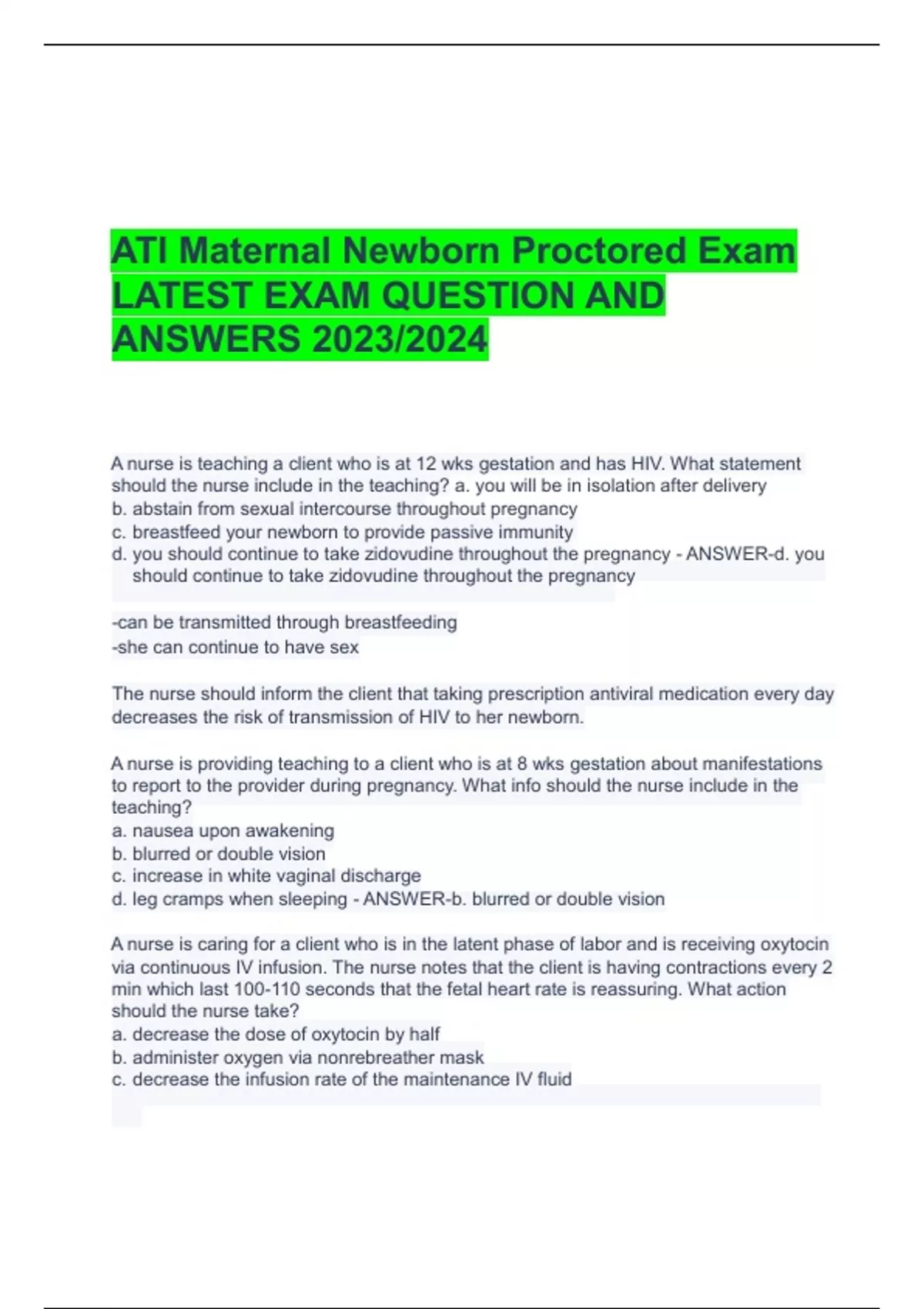 ATI Maternal Newborn Proctored Exam LATEST EXAM QUESTION AND ANSWERS